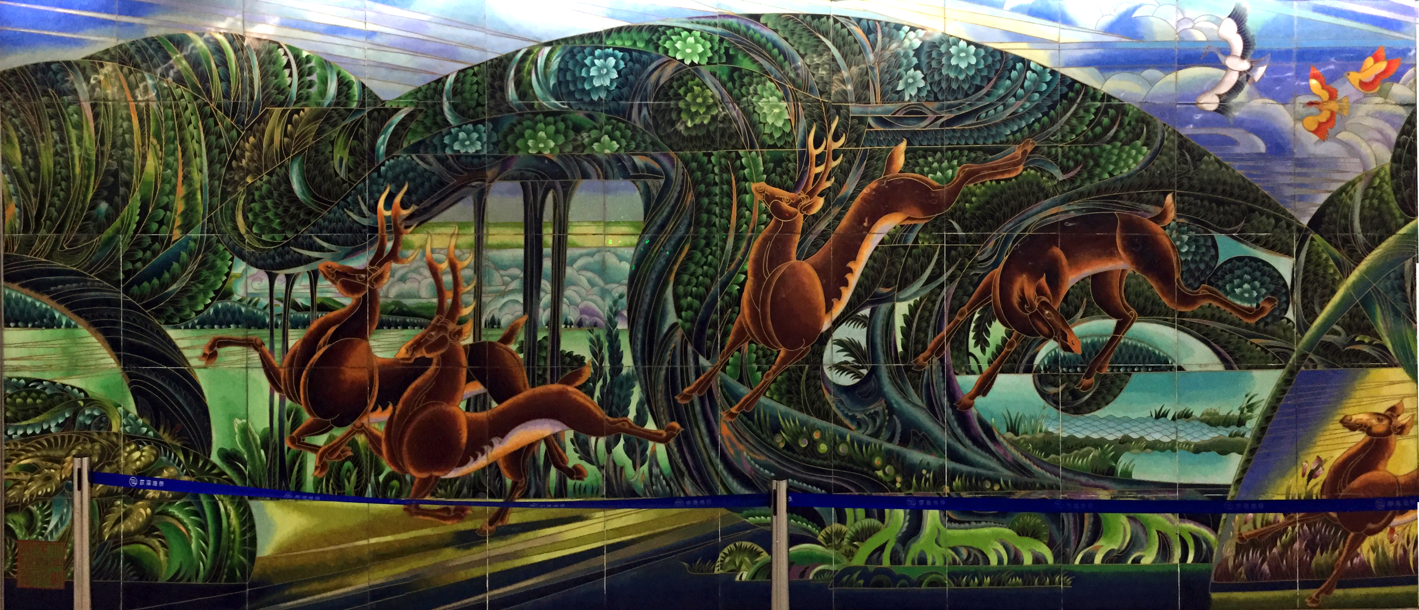 Other recommendations include Gongzhufen's (Line 10) ‘Birds toward the Phoenix’, an allegory about women (traditional emperors were thought of like dragons, while their first ladies were phoenixes) and the artwork in Chedaogou (Line 10), where four small murals blend pictures of a horse and foal, a lion, deer, and birds with matching brass footprints cleverly blended into the floors.