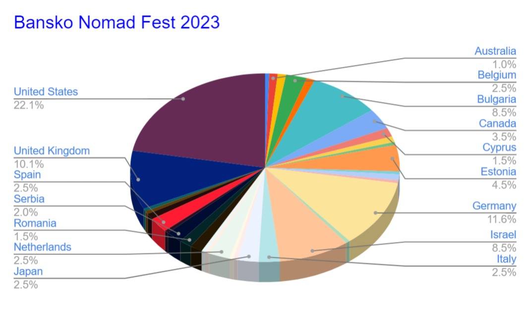 Bansko, Blagoevgrad Jun 30, 2023 (Issuewire.com) - With participants hailing from over 40 countries, including far-flung destinations like Australia and Japan, Bansko Nomad Fest showcases a truly global gathering. The United States takes the lead as the most represented country, followed by Germany, the UK, and Israel. However, in Bansko, you might encounter nomads from all continents (except maybe Antarctica).
