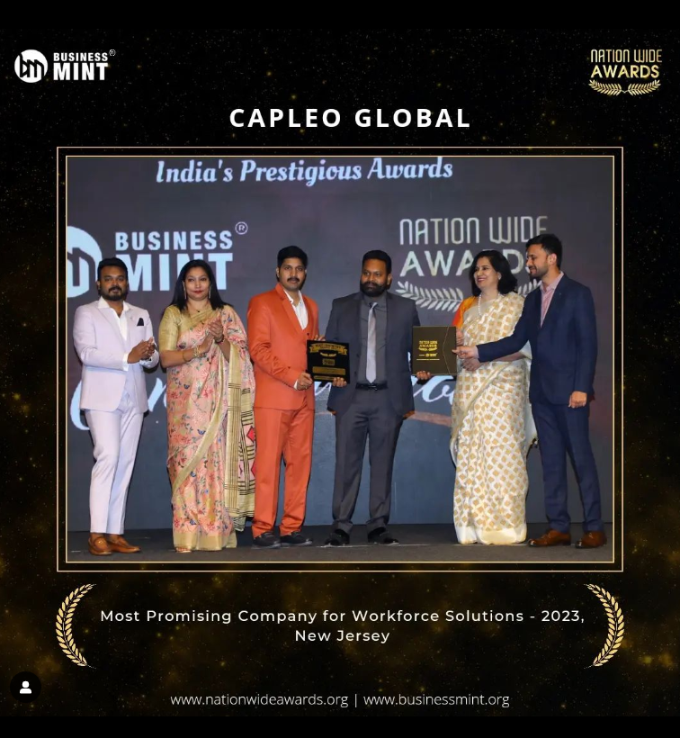 Edison, New Jersey Mar 14, 2023 (Issuewire.com) - Capleo Global, a specialist workforce solutions company, catering to staffing & recruiting services to its clients and candidates across various industry verticals, today announces it has been awarded the “most promising company for workforce solutions 2023” in the Nationwide Awards – 2023” by Business Mint.
