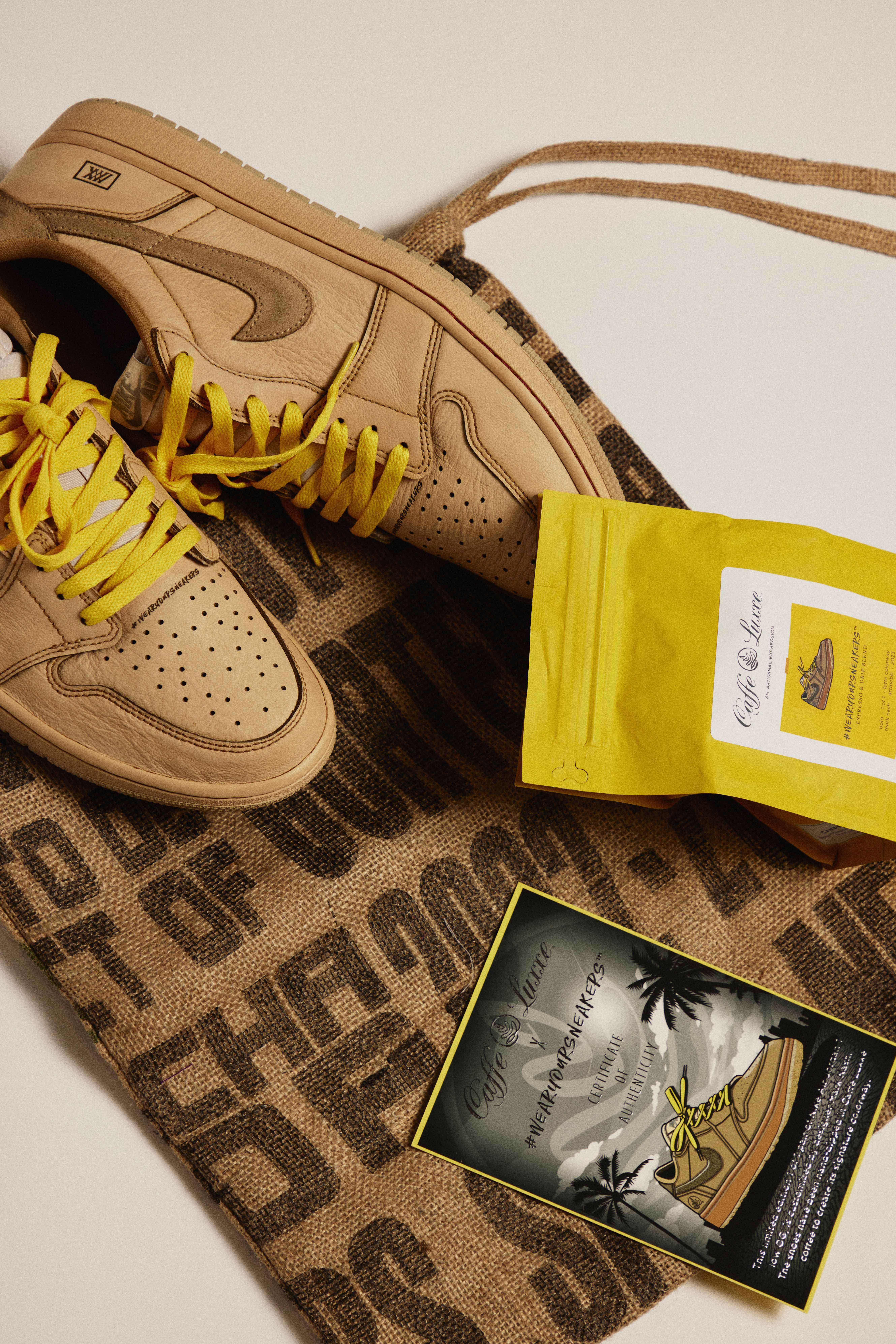 To support local coffee lovers and encourage self-expression, Caffe Luxxe randomly gave away a custom 1-of-1 coffee-dipped Air Jordan 1 OG Low, designed by Mark Nash (Valued at $1,500) accompanied by a certificate of authenticity. Additionally, the uniquely designed package included a custom shoe bag made from an authentic jute coffee bag, along with a custom coffee blend created specifically for this gift set. The supporting design materials were created by Michael Farhat AKA Art Mobb, an LA-based pioneer artist in hyper-realistic spray painting on plexiglass. His passion for sneakers and art was transformed from his usual plexiglass canvas onto paper for this collaboration.
