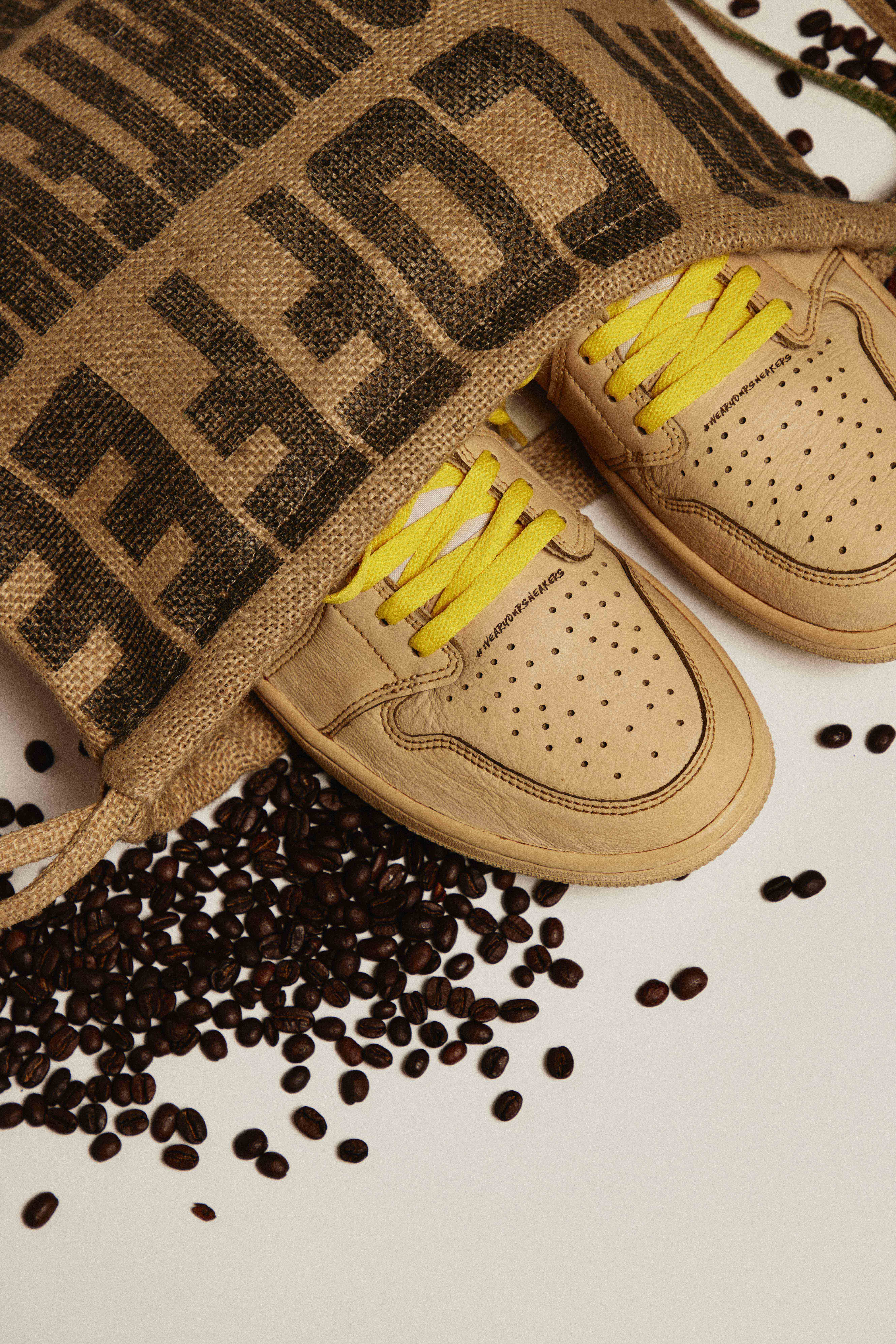 The design of the sneaker is a true celebration of craftsmanship and creativity. Starting with a pristine Nike Air Jordan 1 Retro Low OG in white and neutral gray, the shoe was then meticulously transformed into a stunning Latte colorway using a proprietary hand-dipping technique with actual Caffe Luxxe coffee. Completing the look were flat laces in Caffe Luxxe's signature Italian sunshine yellow.