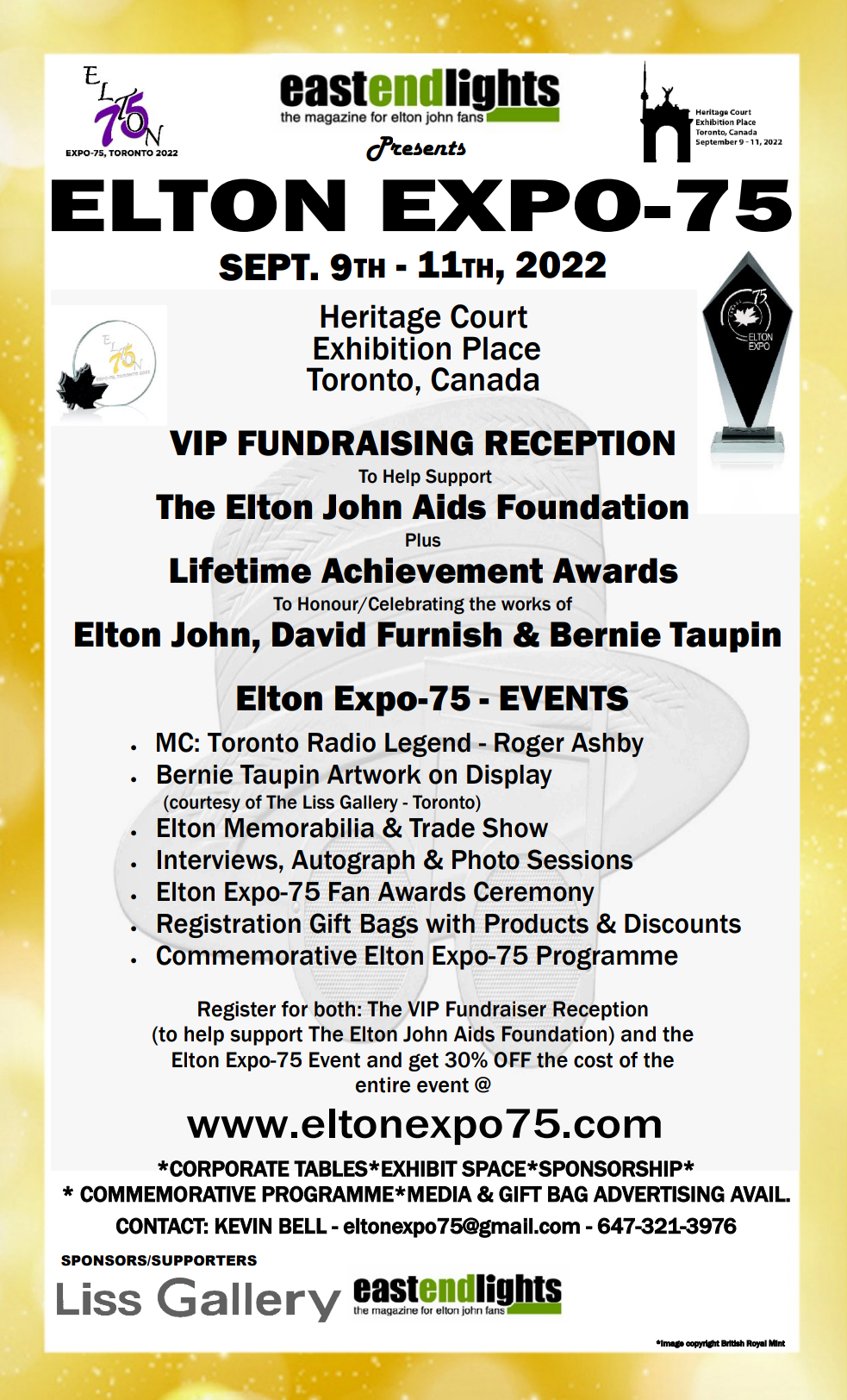 “The Elton Expo-75 event brings together people who have a deep appreciation for everything Elton,” says Kevin Bell, long-time Publisher of East End Lights Magazine. “East End Lights has been providing fans with news on Elton John for over 25 years and we celebrate our 75th issue of the magazine by holding our final Elton Expo in Toronto.”