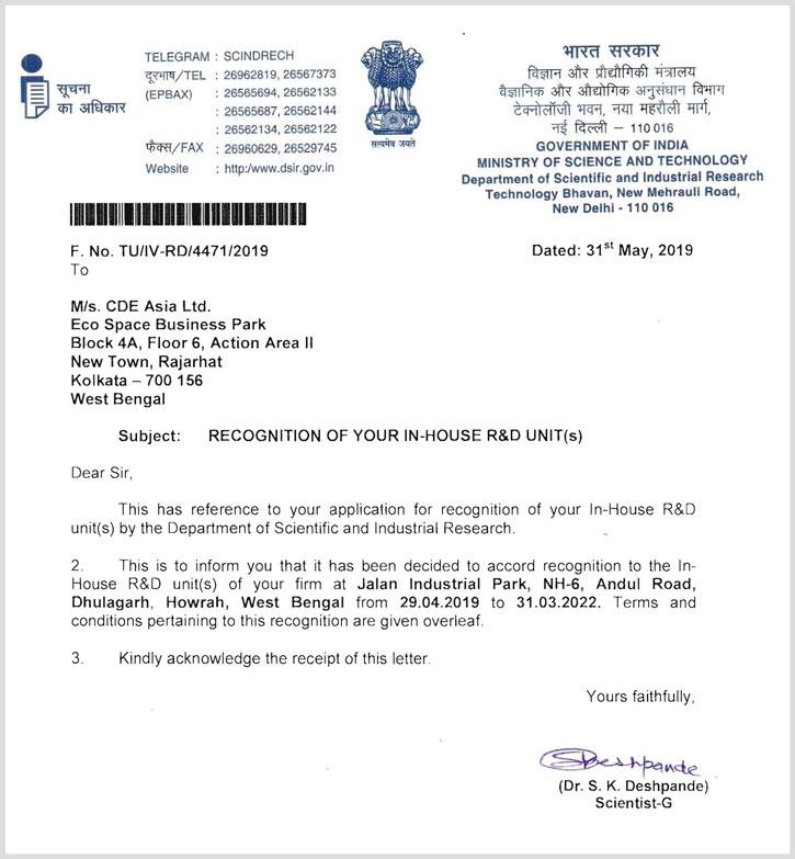 kolkata, West bengal Jul 25, 2019 (Issuewire.com) - CDE Asia, a leading manufacturer of wet processing equipment serving over 24 countries in the Indian subcontinent and South-East Asia, has recently been awarded the prestigious DSIR certification. The much-coveted recognition by Department of Scientific & Industrial Research (DSIR), Govt. of India, is particularly significant as it is the only program that benchmarks industrial research and thereby comments on the excellence of in-house R&D of corporates across the globe. The in-house R&D units recognized by DSIR are also eligible for receiving funds for research purposes from various government departments and agencies, such as DST, DBT, CSIR, ICMR, ICAR and TDB. Apart from this, DSIR accreditation for any unit is a hallmark of value and prestige for continued research in technologies, products, process, design, quality, ranges and so on.