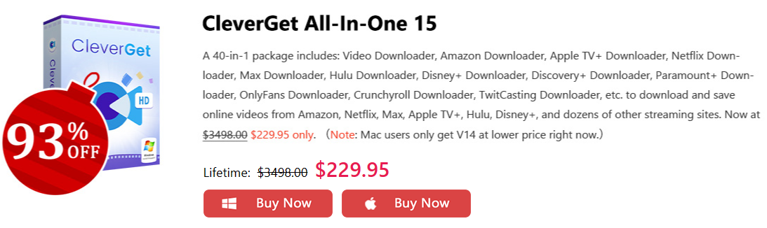 CleverGet Hulu Downloader is offered with a 50% discount as well as other modules, and participants can take it at $49.97 now. Besides, CleverGet All-In-One V15 for Wins is available on this activity at $229.95 after a discount of 93% off for a lifetime plan, though the original cost is $3498.00. Meanwhile, Mac users can get V14 at a lower cost according to the updated version for Mac right now.
