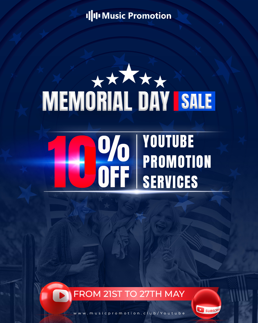 Austin, Texas May 21, 2025 (Issuewire.com) - Gaining audiences on YouTube has become quite difficult nowadays. YouTube is the largest video streaming platform where millions of music artists are trying to showcase their talent. The competition on this platform is quite tough. And that is why everyone is going through a hard time right now. Video promotion is the only solution that can lead one to attain much success. This Memorial Day, promoting your music video is a hassle-free way. Music Promotion Club, a proficient YouTube video promotion company, is offering a Memorial Day sale to all music video makers on YouTube. One can get a flat 10% discount from 21st to 27th May.