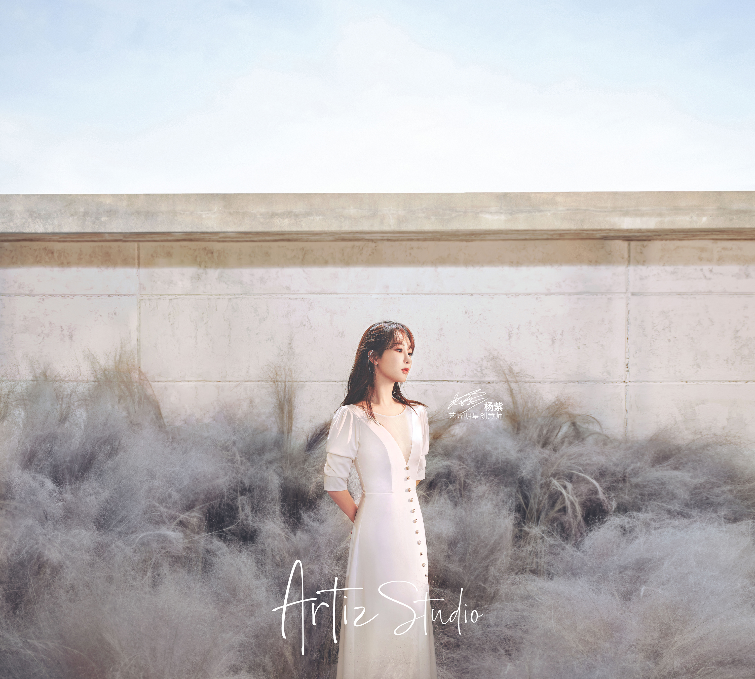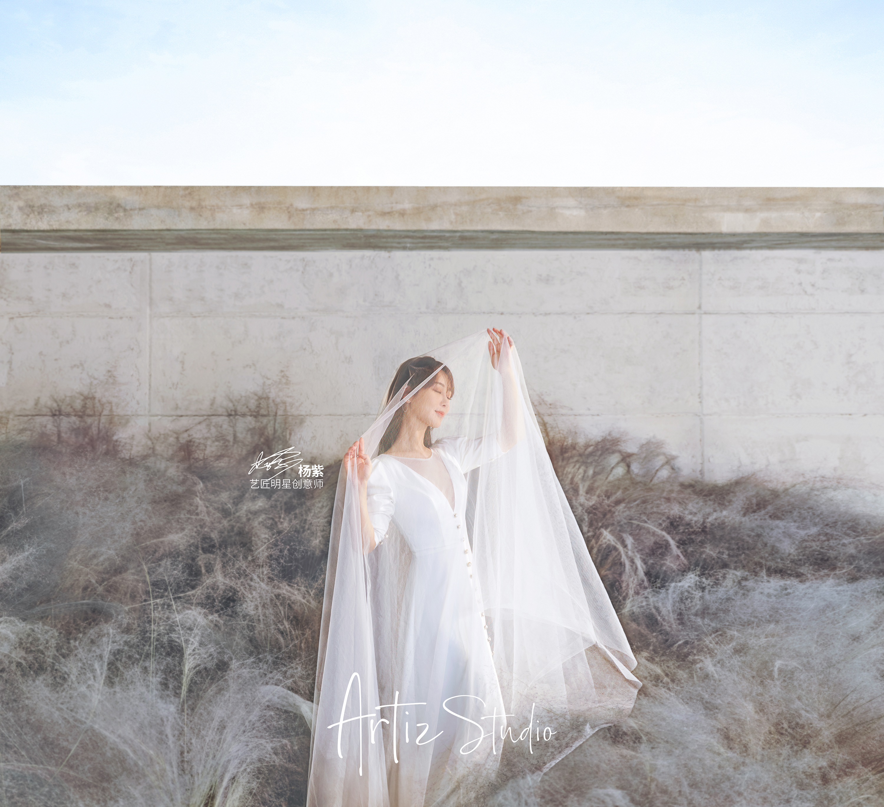 Standing amongst Jeju island’s crown grass, bathe in Mediterranean sunshine with waves of California sea breeze rushing through coalesce natural elements to bring forth a unique artistic tone setting, inspiring brides all around the world. The background concept will soon be release and accessible in the various Artiz Studio establishments with couples being able to capture the same scene as Yang Zi.
