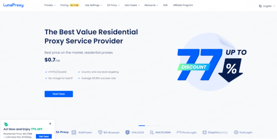 Website: LunaProxy residential proxy prices as low as $0.7