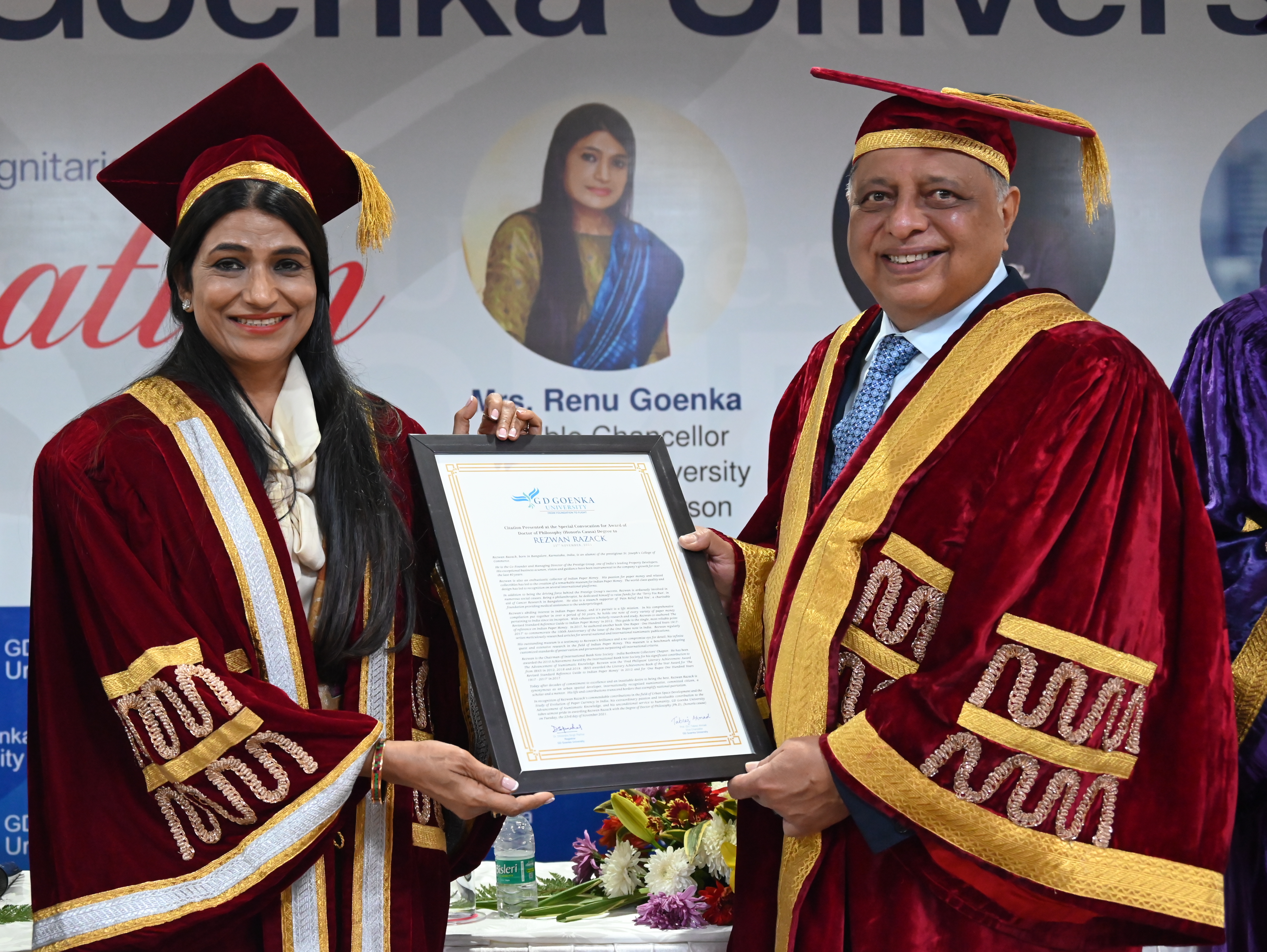 Gurgaon, Haryana Nov 23, 2021 (Issuewire.com) - Numismatists and real estate giant Rezwan Razack was conferred an honorary doctorate on Tuesday by GD Goenka University. The honorary doctorate was conferred on him during a special convocation attended by Chancellor of the GD Goenka University Mrs. Renu Goenka, Pro-Chancellor Mr. Nipun Goenka, Vice-Chancellor Prof. Dr. Tabrez Ahmad, Chairman of M3M group Mr. Basant Bansal, and Registrar of the university Dr. Dhirendra Singh Parihar. Prof. Dr. Tabrez Ahmad, Vice-Chancellor of the GD Goenka University, praised Razack for his contribution to numismatic studies and research.