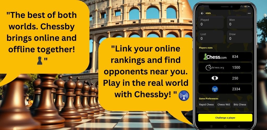 Online Rating Integration: Players can link their Chess.com and Lichess.org ratings to their Chessby profiles, ensuring competitive and balanced matchmaking in over-the-board (OTB) games.: Players can link their Chess.com and Lichess.org ratings to their Chessby profiles, ensuring competitive and balanced matchmaking in over-the-board (OTB) games.