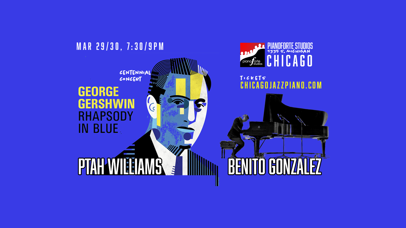 March 29 and 30 at 7:30 and 9 pm, the centennial concerts of the classic 1924 George Gershwin groundbreaking work, “Rhapsody in Blue” will be performed by St. Louis Pianist Ptah Williams in a program of classics of the Great American Songbook, followed by the acclaimed Venezuelan pianist Benito Gonzalez in his only Chicago appearance of the spring.