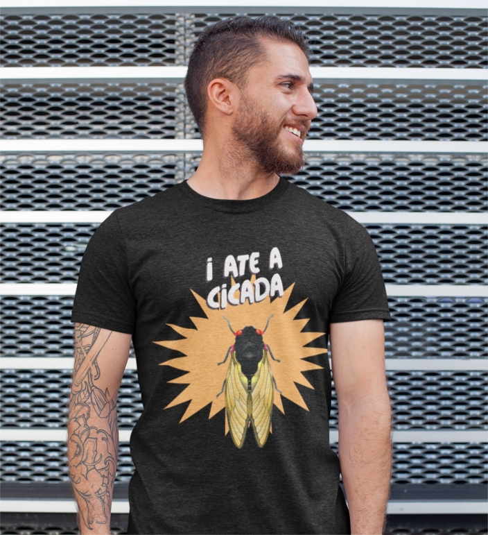 Now that they’re making reemergence for the 2021 invasion, Sugarbaker has designed a new line of Cicada Brood X line of clothing and gifts to honor this generation of cicadas and to give her friends on the East Coast a good laugh in the middle of their misery. “From t-shirts to coffee mugs, cicada candles to keychains, your Cicada Couture will make you the talk of the supermarket, bingo parlor, or your local dime store, whether you want to be or not,” laughs Sugarbaker.