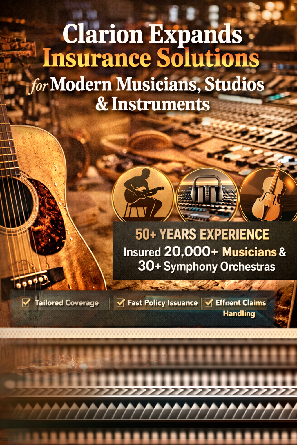 Modern musicians who want to spread their music across the globe don't have to worry about their instruments and other assets when they travel. Similarly, music studio owners don't need to worry about their studio's safety when they are not around. Clarion creates solutions that offer the best financial protection and give the maximum peace of mind.