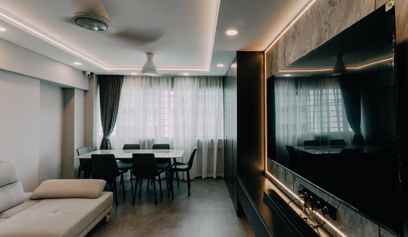 An interior design for a 4-room HDB flat needs extra care. These homes have a good bit of space but can still feel tight if not planned well. The studio uses tricks like mirrors to bounce light and glass panels to open up views.