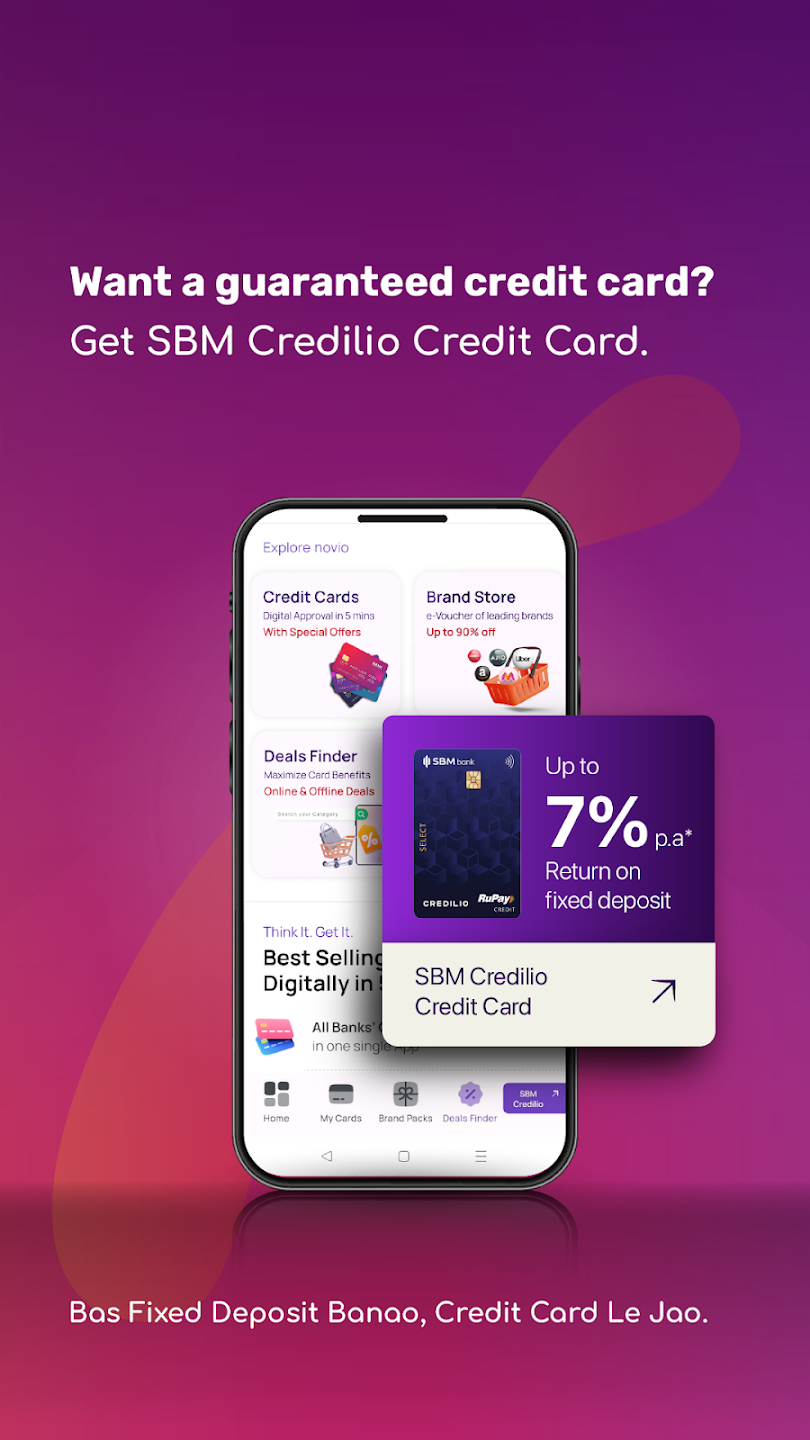 Guaranteed Card Concept: To ensure financial inclusion, novio introduces its guaranteed card concept, allowing users to build their credit scores effortlessly. By booking a fixed deposit online, users secure an SBM Credilio Credit Card instantly with 1% unlimited cashback benefit and earning up to 7% interest on their deposit while enjoying the perks of a credit card.