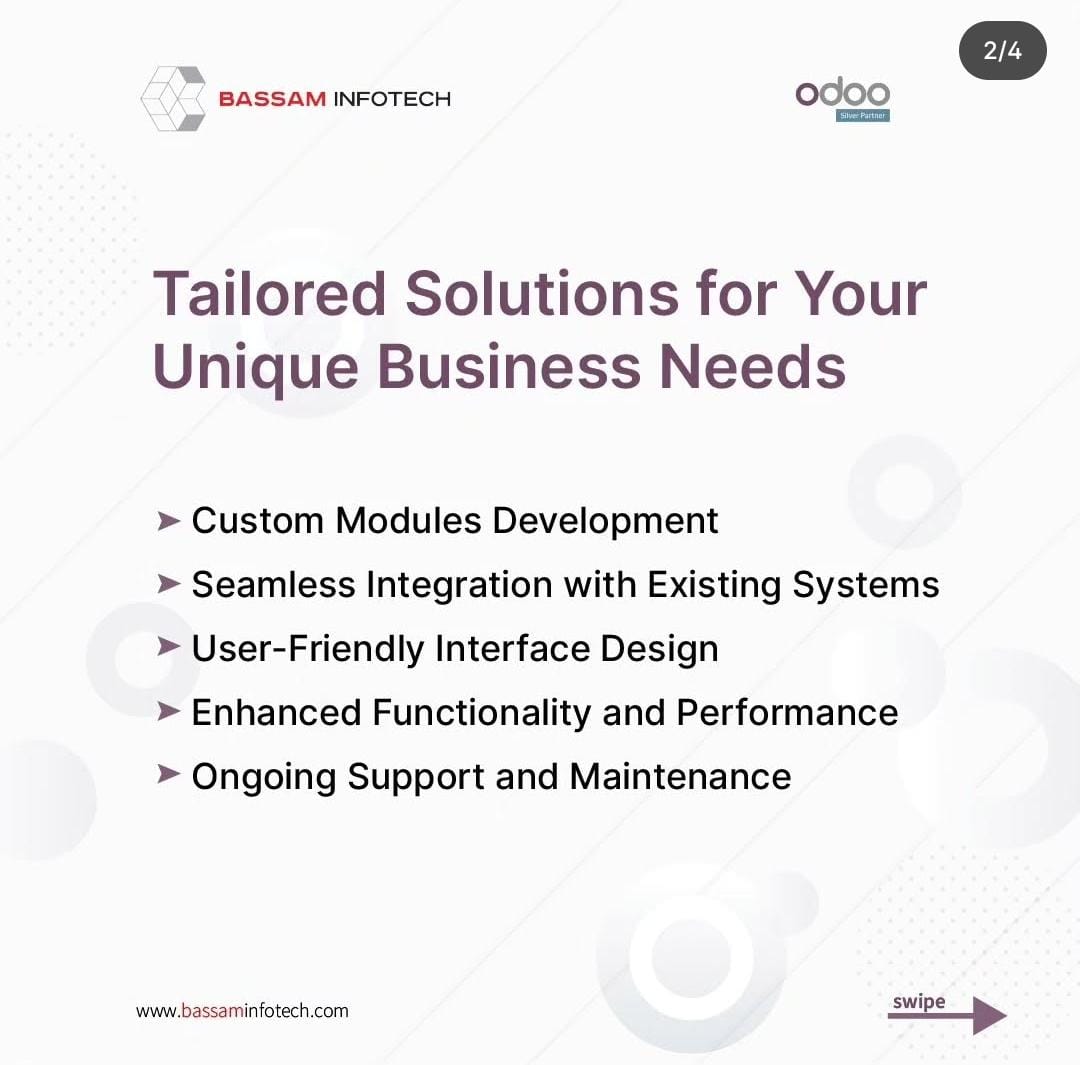 Take the first step toward a more efficient future with Bassam Infotech’s Odoo customization services. Let us help you grow and optimize your business with custom-made ERP software.