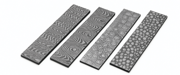 The Damaworks product line includes three steel families. DSC® Carbon Damascus billets are produced from 1.2842 and 1.2767 tool steels in 160-layer configurations, achieving up to 62 HRC after heat treatment, and are available in nine patterns. DSC® Inox Stainless Damascus billets are produced from 1.4034 and 19C27 steels in 120-layer configurations, achieving up to 62 HRC and carrying food-contact approval for culinary and jewelry applications. Historical Damascus billets are forged from decommissioned military tank cannon barrels — including the Leopard 1 and M-48 Patton — combined with tool steel, producing 320-layer billets at 63-plus HRC. Historical stock is the final inventory with no possibility of reorder.