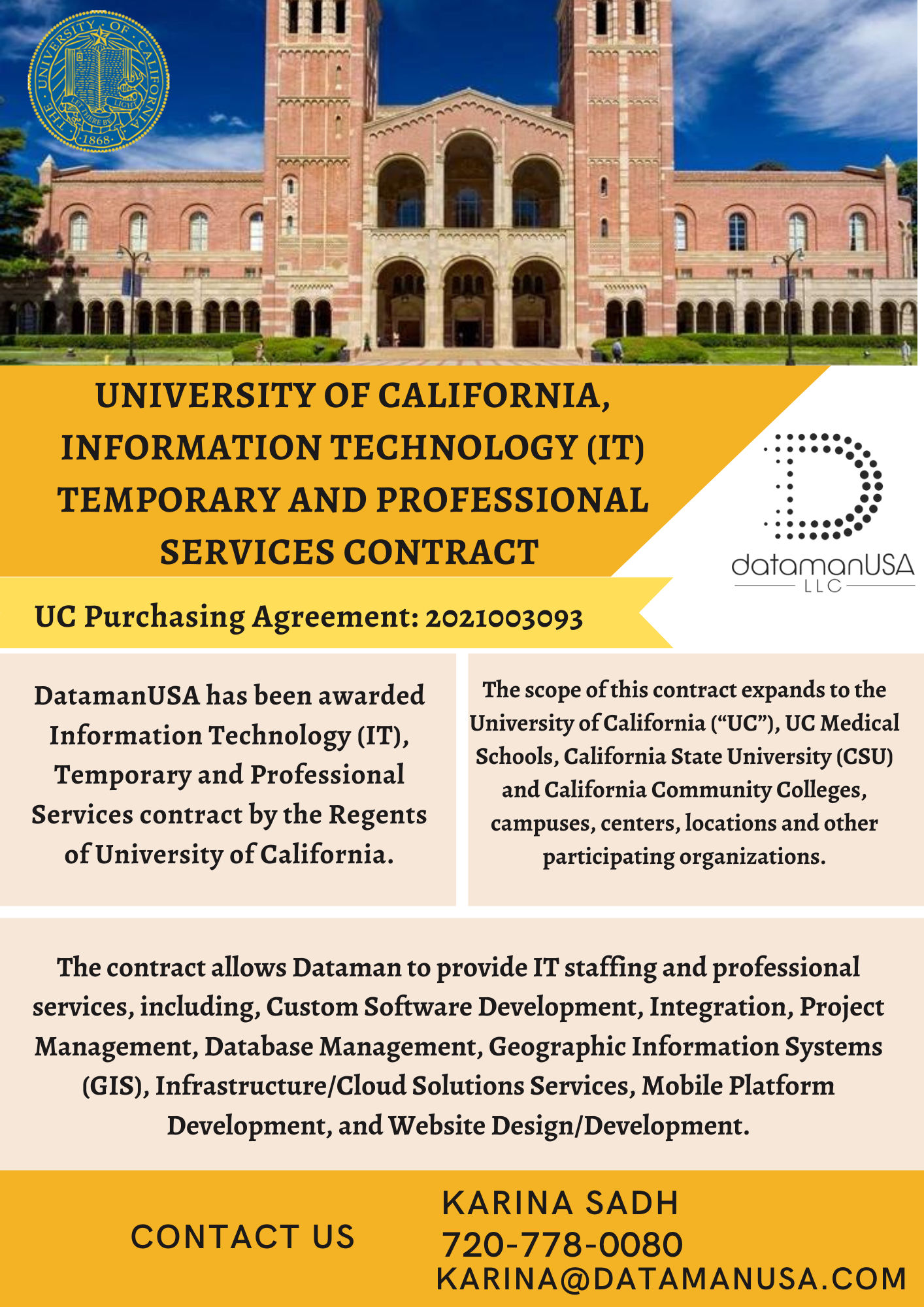 Available to all the University of California (“UC”), UC Medical Schools, UC Office of President, UC Hastings College of Law, Lawrence Berkeley National Lab, The Division of Agriculture and Natural Resources, California State University (CSU), and California Community Colleges, campuses, centres, locations, and other participating organizations. For more information about Dataman’s Information Technology (IT) Temporary And Professional Services Contract, please visit https://www.datamanusa.com/UCIT.aspx