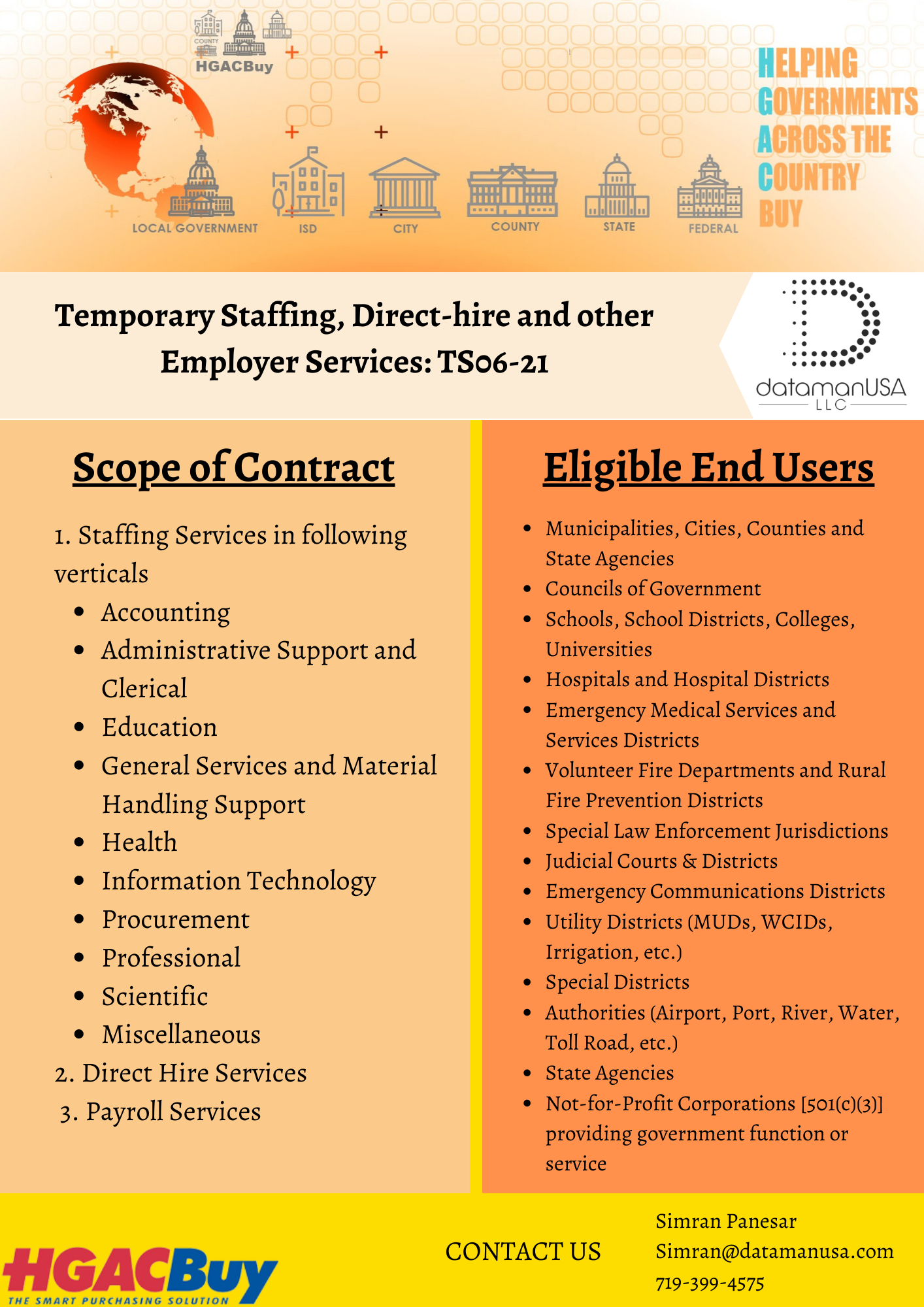 Through this cooperative contract, members of HGACBuy can leverage Dataman’s services for their staff augmentation and temporary staffing needs in categories that include Accounting, Administrative Support, Clerical, Education, General Services and Material Handling Support, Health, Information Technology, Procurement, Professional, Scientific, and others, as well as for Direct Hire and Payrolling Services. To know how you can utilise Dataman's services through this contract HGACBuy Contract
