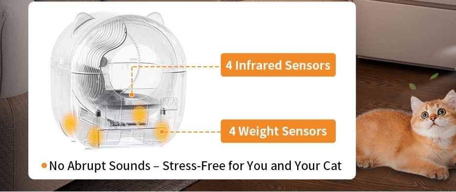 Multiple Redundancy Design: The four - fold sensors are not simply repetitive settings but a carefully designed redundant system. When one sensor malfunctions or is interfered with by the external environment, the other three sensors can still function properly, ensuring accurate detection of the cat entering and exiting the litter box. This design significantly reduces the likelihood of misjudgment. Even in complex environments or when sensors encounter occasional abnormalities, the cleaning process can be triggered at the right time.