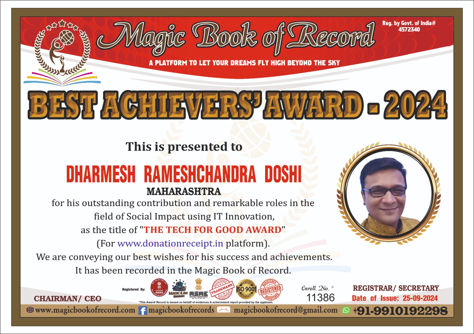 Mumbai, Maharashtra Dec 19, 2024 (Issuewire.com) - Solution Planets, a leading Indian technology company, is thrilled to announce that it's founder Dharmesh Doshi has been recognized with the Best Achievers' Award - 2024: The Tech for Good Award for its innovative donation receipt platform.