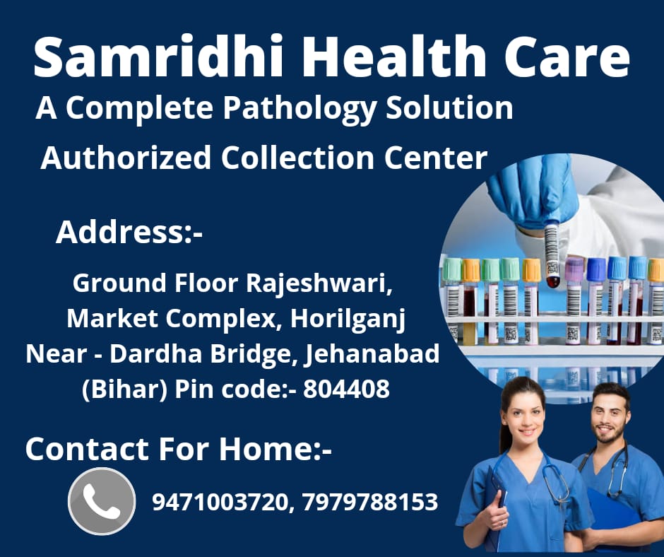 Jahanabad, Bihar Mar 14, 2022 (Issuewire.com) - Samridhi Health Care is the best pathology lab in Jehanabad. Pathology is that branch of diagnostics that studies the bodily fluids of our bodies like blood, tissue urine, stool, etc. based on these studies and analyze the medical well-being of the patient can be determined. Existing diseases, deficiencies, or any preventative future problems can also be identified. From time to time we suffer from ailments for a long time and the cause is not known. Then again simple diagnostic tests can help solve and identify the problem. These testing would include blood tests or even simple radiological imaging. All the diagnostic facilities are available at the blood test center in Jehanabad.