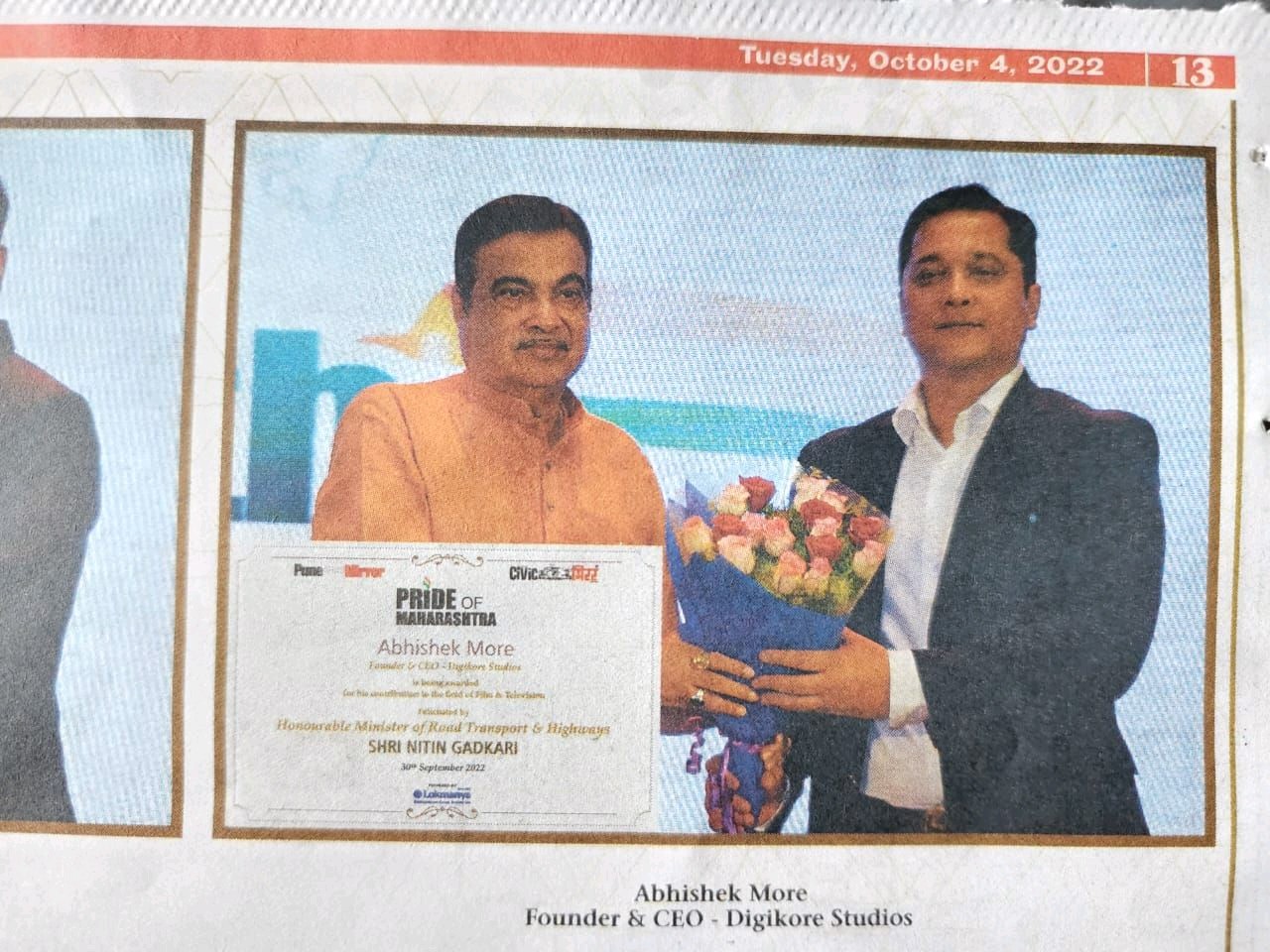 Pune, Maharashtra Oct 7, 2022 (Issuewire.com) - Digikore Digital CEO Abhishek More was honoured as Pride of Maharashtra by honourable Shri Nitin Gadkari (Honourable Minister of Road Transport & Highways, Govt. of India). The award ceremony was hosted on 30 September 2022 at JW Marriott, Pune. CEO Abhishek More feels grateful about receiving such a prestigious award from the Government of Maharashtra. The award ceremony was hosted to honour and reward the Businessman who makes a difference in society with their product/services.