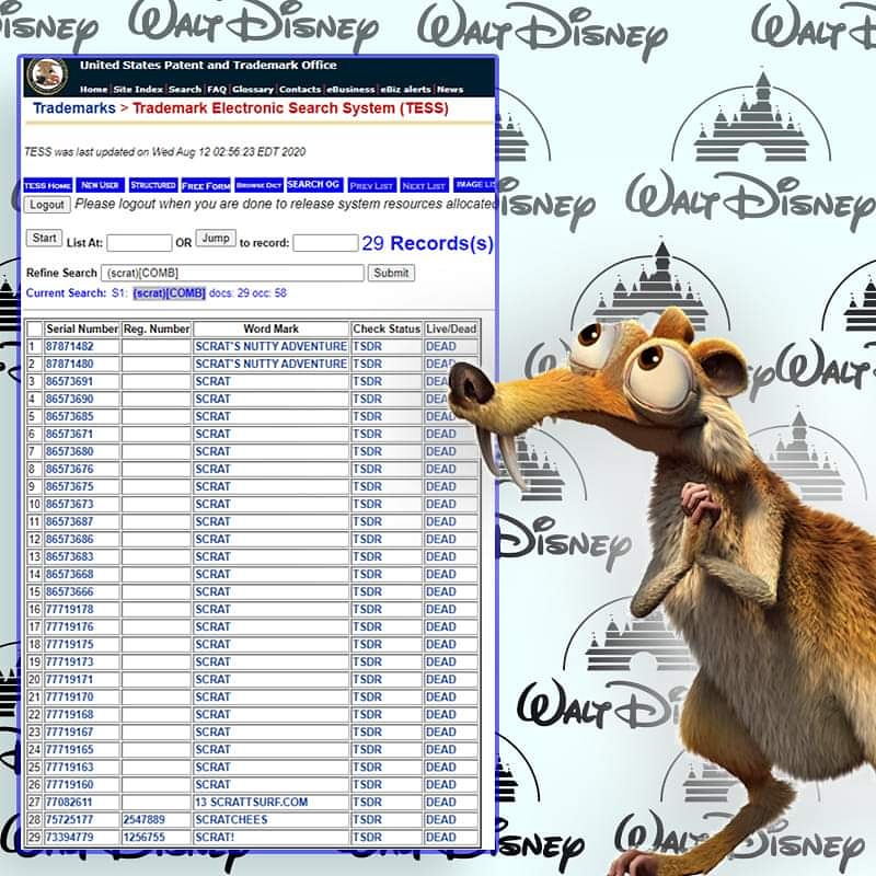 20th Century Fox abandoned all their Scrat Trademarks on Mar 11, 2020 leaving Disney owning none. Ivy Silberstein was the first party to apply for the Sqrat Trademark on June 7, 1999. Fox did not file for their Scrat Trademarks until April 2009 which was Seven years after the first Ice Age movie was released. March 15, 2022 was the 20th Anniversary of the Ice Age Movie Franchise. 20th Century Fox applied for 26 Scrat Trademarks over the last 20 years but all have been abandoned while the Silberstein Trademarks preceded to registration. "After Fox/ Walt Disney abandoned all Scrat, my Trademark Attorney David Einhorn wrote to me, "We Won!"-- Ivy "Supersonic" Silberstein
