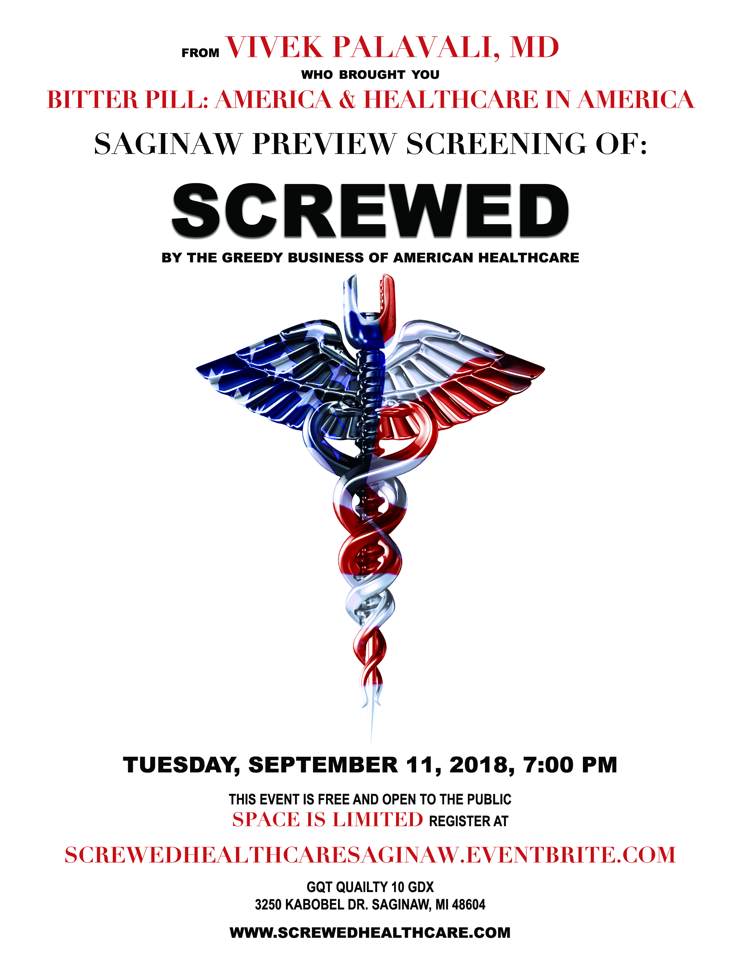 Screwed – By The Greedy Business Of American Healthcare will screen in Saginaw, MI at the Quality 10 GDX Theater on September 11, 2018, at 7 pm followed by a question and answer session with the director, Dr. Vivek Palavali. This screening is free and open to the public; however, seating is limited. Those wishing to view the film must register at www.screwedhealthcaresaginaw.eventbrite.com.