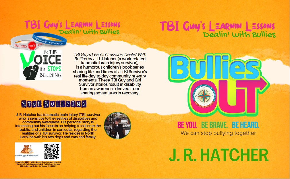 "TBI Guy's Learnin' Lessons: Dealin' With Bullies," by J. R. Hatcher - a work-related traumatic brain injury (TBI) survivor - is a humorous children's book series title that shares life and experiences of Hatcher as a TBI Survivor in day-to-day community re-entry snapshots. TBI Survivor stories result in disability, and human, awareness in sharing TBI Guy's adventures in recovery and includes, sorrowfully, "Dealin' With Bullies".