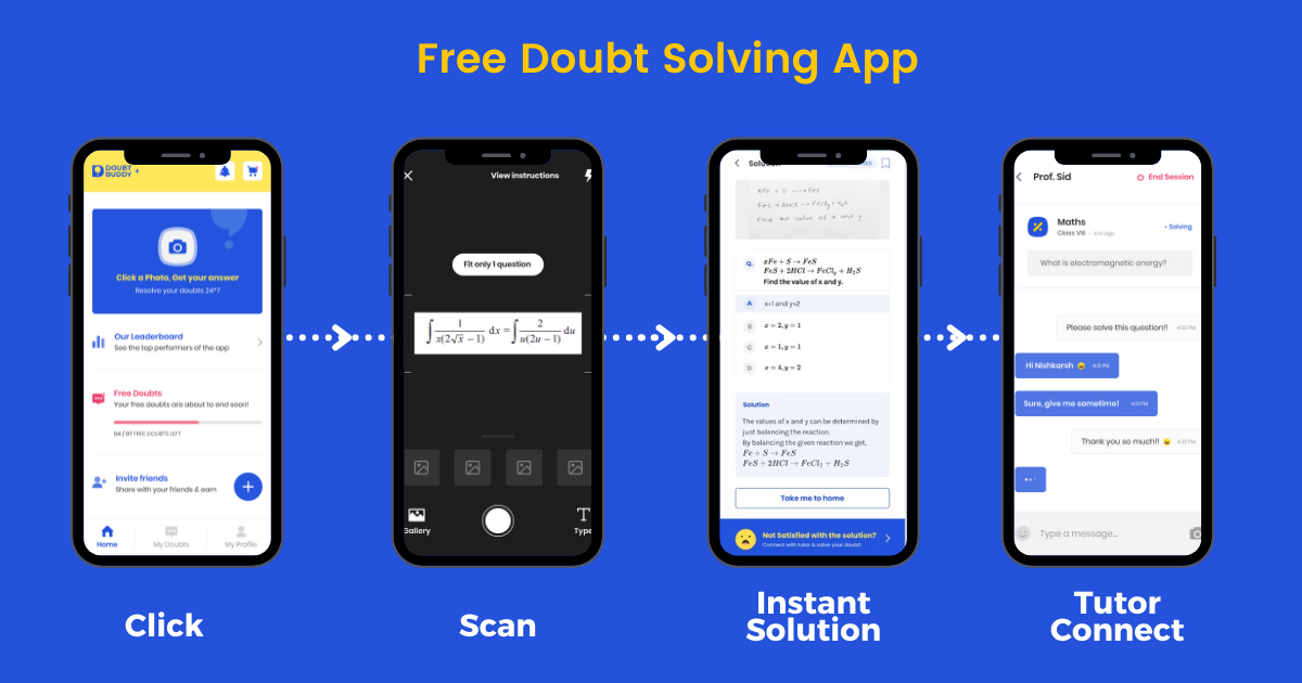 Students of IIT JEE, IIT aspirants, NEET, CBSE, ICSE, State Board class 1 to class 12, physics, chemistry, bio, maths, or mathematics can just take a snapshot of the question within the Doubt Buddy App and with our solutions data, students will get instant solutions for free and students can further connect to the best tutors online and do the chat as chat or audio chat - which gives the highly personalised experience among other doubt solving apps,