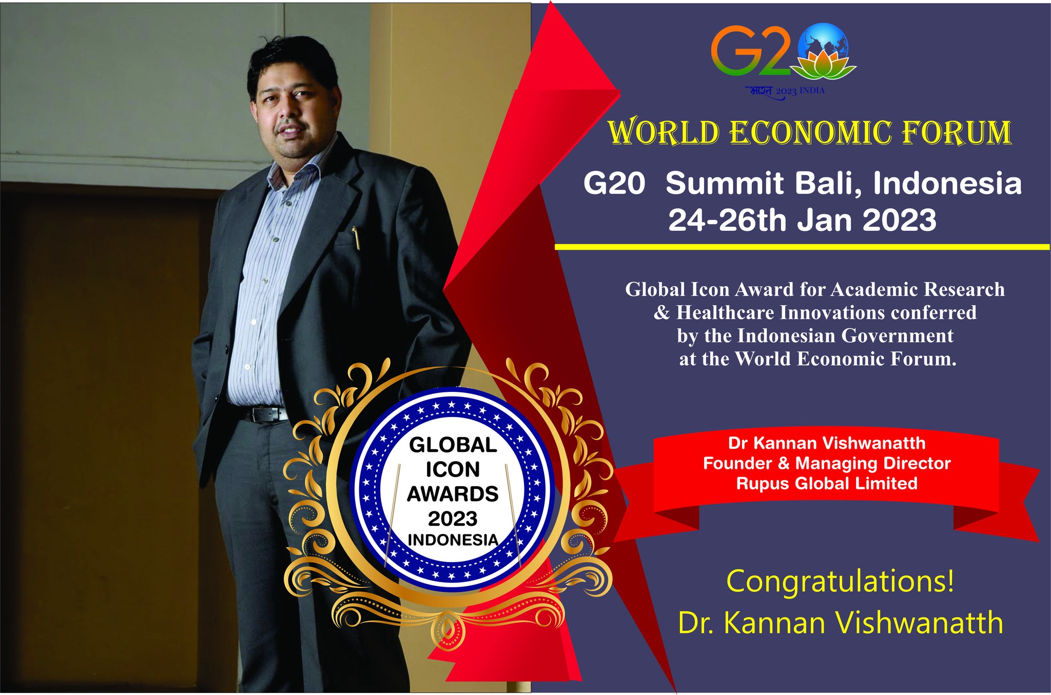 Hong Kong, Hong Kong S.A.R. Jan 28, 2023 (Issuewire.com) - Global Economic Forum G20 Initiative Summit 2023 organized by the Indonesian government held at the Royal Palace, Bali, Indonesia on 24th Jan 2023 witnessed the participation of top industry leaders from G20 Countries From 24-26th Jan 2023. The world’s most influential political, commercial, cultural, educational, and other leaders came together at the Global Economic Forum to set global, regional, and industry agendas. As the G20 Bali summit came to an end on 16th November 2022, Indonesia handed over the G20 presidency to India for the next year & the first international Global Economic Forum with G20 Initiatives kick-started with Bali Indonesia. Dr. Kannan Vishwanatth, the founder & managing director of Rupus Global Limited was conferred with the prestigious Global Icon of the year for academic research & Healthcare Innovations at the World Economic Forum at Royal Palace, Bali, Indonesia 2023.