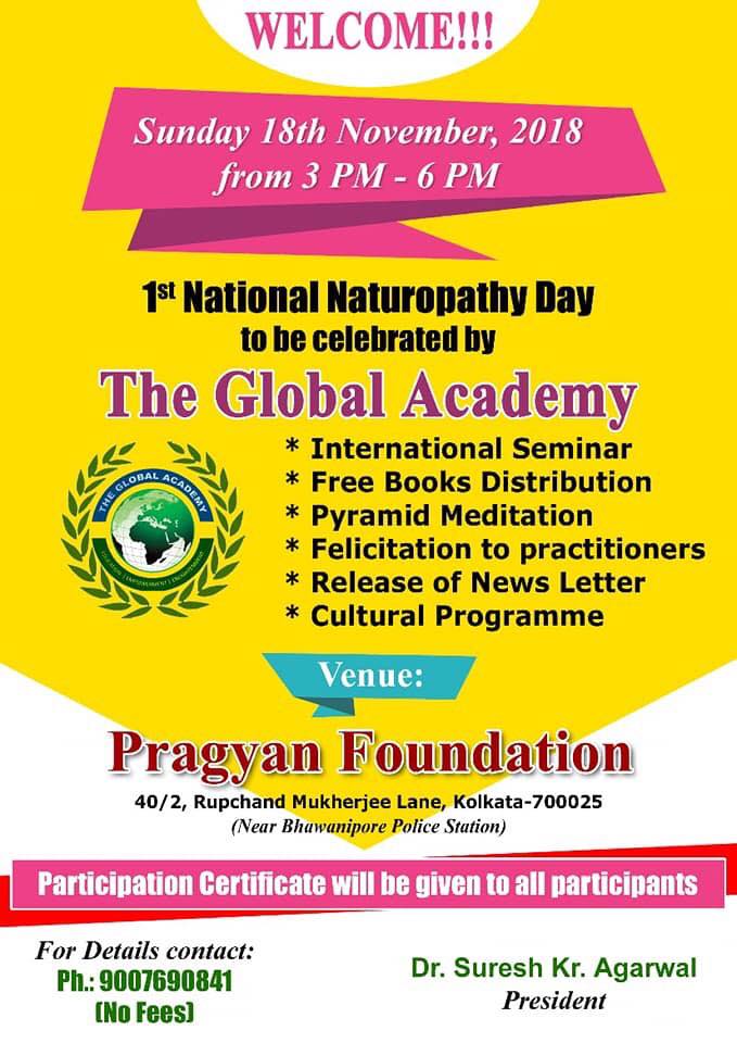 The Ministry of AYUSH, Government of India, has declared the day of 18th November as a Naturopathy Day to commemorate the contribution of Mahatma Gandhi towards Naturopathy Medicinal System. Dr. Suresh Kumar Agarwal has announced the conduct of an International Seminar, Free Books Distribution, Pyramid Meditation, Felicitation to Practitioners, Release of Newsletters and a Cultural Programme on the occasion of National Naturopathy Day.