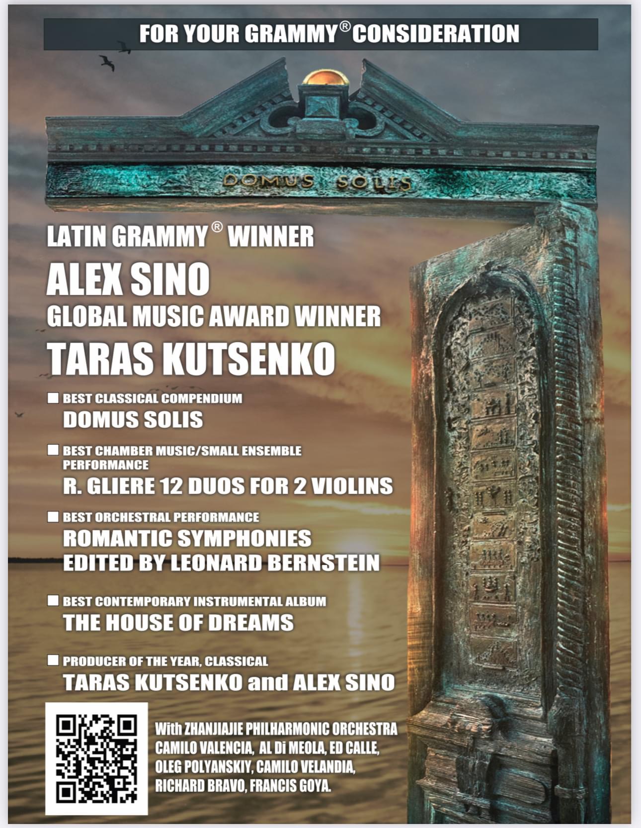 New York City, New York Oct 13, 2024 (Issuewire.com) - Billboard Official Grammy Contenders Dr. Alex Sino, Doctor of Philosophy, NYU Graduate, and the distinguished American music producer and trailblazing Latin Grammy Award Winner, has submitted four groundbreaking albums for consideration at the 2025 Grammy Awards: Domus Solis, R. Gliere 12 duos for 2 violins, Romantic Symphonies edited by Leonard Bernstein, and The House of Dreams. This remarkable American artist and producer, known for breaking barriers as the first Ukrainian-born recipient of the prestigious Latin Grammy, continues to redefine the global music landscape with his innovative sounds and compelling storytelling.