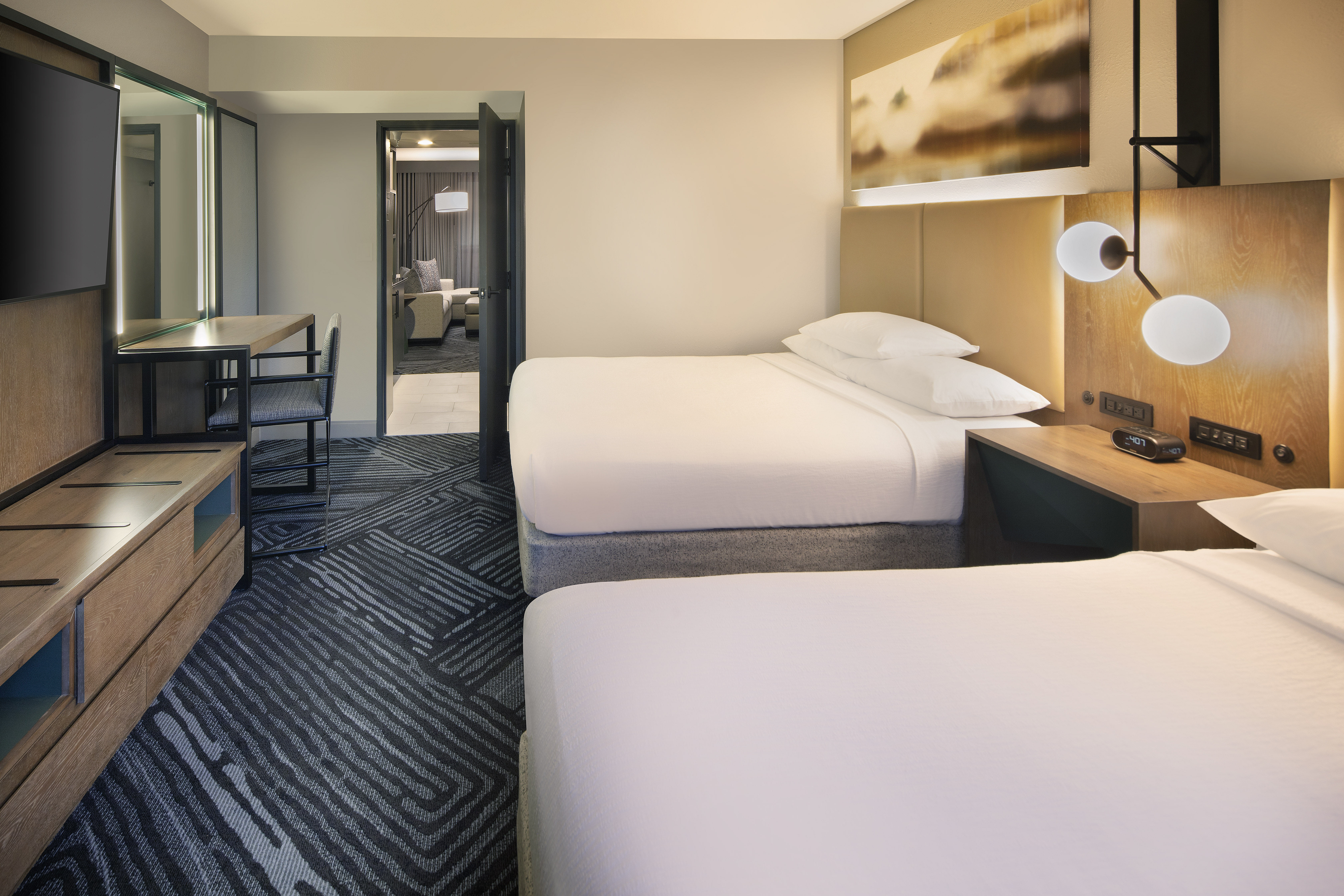 The suite configurations were diversified in an effort to accommodate families, business travelers, and group needs. Guest suite accommodations offer one king or two queen beds with a living room and queen-size sleeper sofa. Bathrooms underwent complete modernizations, including the addition of walk-in showers. Additionally, all suites are equipped with kitchen necessities such as a microwave, coffee maker, and mini-refrigerator for travelers to take advantage of as they embrace the local culinary scene.