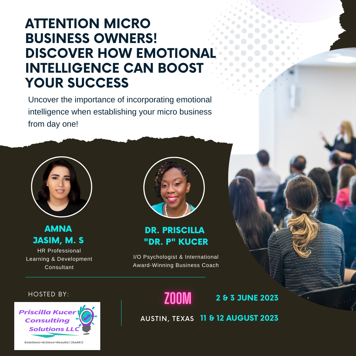 Austin, Texas Jul 29, 2023 (Issuewire.com) - Priscilla Kucer Consulting Solutions LLC®, a leader in innovating training for entrepreneurs and micro/small business owners, is excited to announce its groundbreaking two-day workshop for micro small business owners. The intensive Emotional Intelligence workshop is set to take place on June 2-3, 2023, and promises to significantly enhance participants' leadership and relationship-building skills.