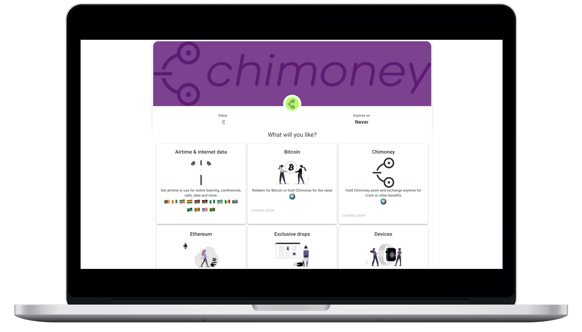 - For employees or event attendees, they are not tied to a gift card that they do not want or need. Chimoney gives them options to redeem airtime, crypto, merchandise, and more, and, best, they can hold Chimoney forever.