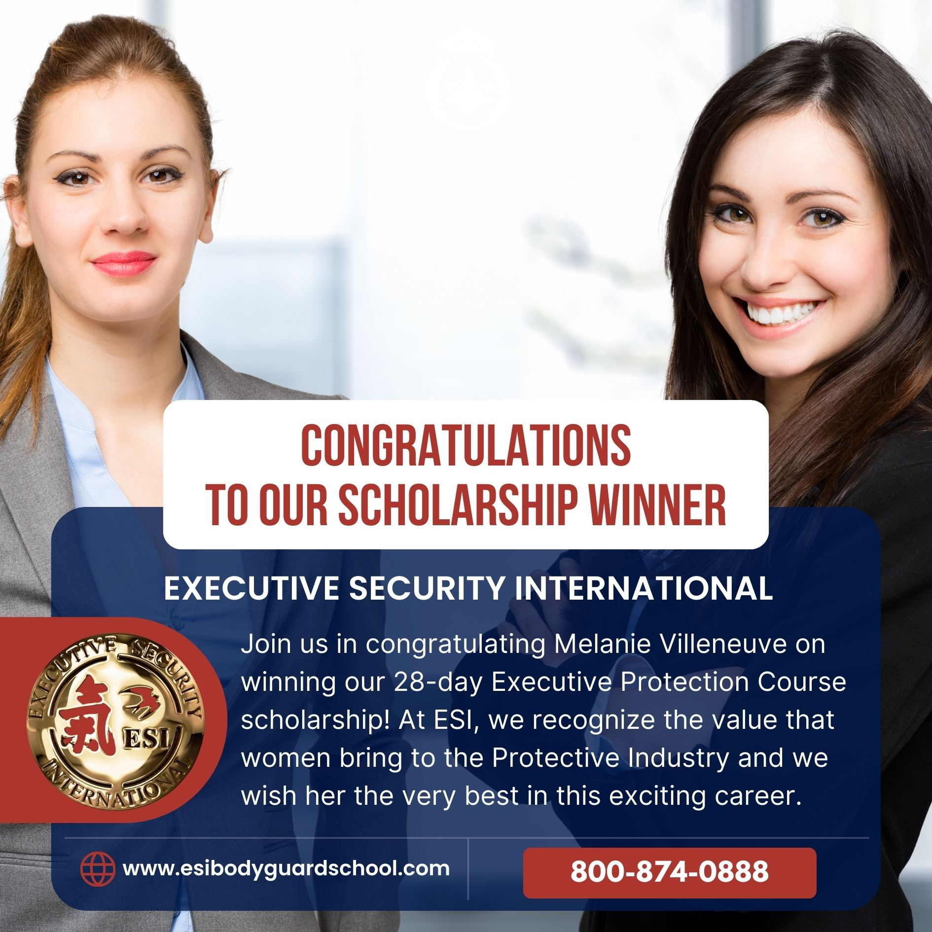 Grand Junction, Colorado Apr 22, 2024 (Issuewire.com) - Executive Security International (ESI) proudly announces Melanie Villeneuve as the recipient of the Executive Protection Scholarship. This scholarship is a testament to ESI's continuing commitment to fostering diversity and inclusion within the protective industry by providing full scholarship opportunities to female students.