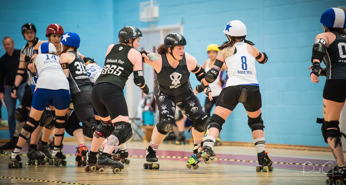 Roller Derby is an athletic, fast-paced, high adrenaline sport played on quad roller skates on an oval-shaped track. Each game comprises of two 30-minute periods, in which each round lasts up to 2-minutes and is known as a “jam”. During a jam, five skaters from each team, 10 in total, take to the track: one is a “jammer”, identified by the star on their helmet, and is responsible for scoring points. The other 4 skaters are known as “blockers”, they try to stop the opposing jammer from passing them while also playing offence for their own jammer.