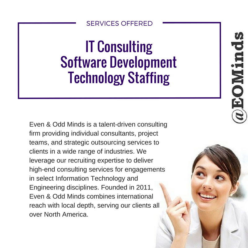 Even & Odd Minds is a talent-driven consulting firm providing individual consultants, project teams, and strategic outsourcing services to clients in a wide range of industries. We leverage our recruiting expertise to deliver high-end consulting services for engagements in select Information Technology and Engineering disciplines. Founded in 2011, Even & Odd Minds combines international reach with local depth, serving our clients all over North America.