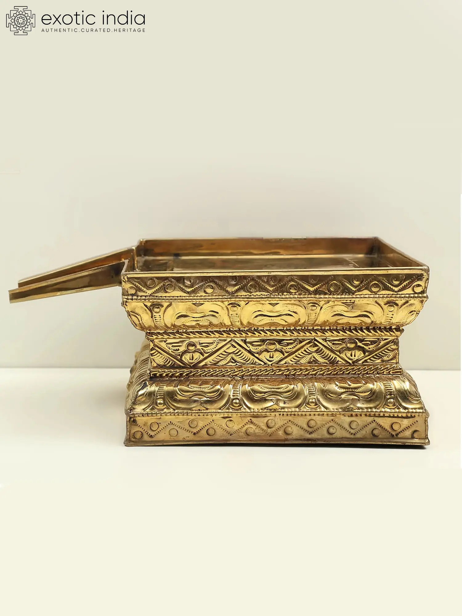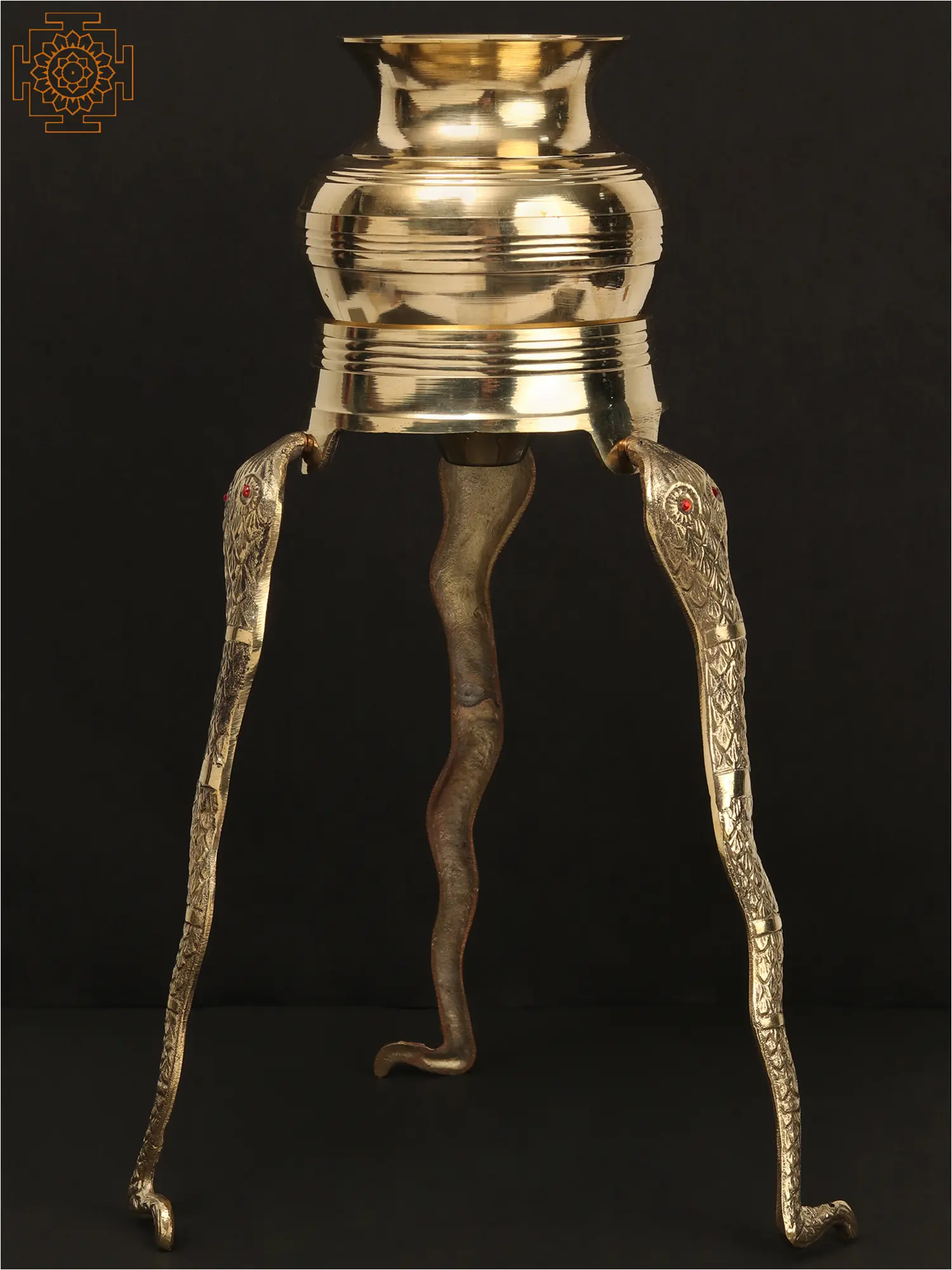 Made from high-quality brass, each Patra in this collection is a testament to the diligent skills of the artisans who pour their utmost care and dedication into bringing the religious essence to the masterpieces. Our ornamental cuboidal Abhishek Puja accessories are gracefully adorned with motifs inspired by traditional South Indian art. The bright golden finish offers them an opulent appeal inducing a reverential mood in devotional service. The hanging Shiva Linga Abhishek Patra is so made that the Kalash receives water from atop and showers it on the Shiva Lingam through the strainer at the bottom. Uniquely crafted Abhishek Patra in the shape of a serpent forming a hood above the plate is a pure work of art to be appreciated. On the tray of the Patra, the deities are seated, bathed, dressed and decorated accompanied by reciting hymns and chanting of the holy names. Each Abhishek Patra then opens into a narrow passage from where the ‘Charanamrita’ or the sacred nectar is collected in another metallic vessel and distributed amongst the devotees.