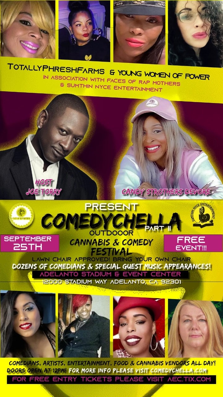 Washington, D.C, District of Columbia Aug 18, 2021 (Issuewire.com) - TotallyPhreshFarms and Young Women of Power in association with Faces of Rap Mothers®™ and Sumthin Nyce Entertainment present ComedyChella Part II Outdoor Cannabis and Comedy Festival, which is totally FREE and lawn chair approved (bring your own chair). Join dozens of comedians and special guests who provide special appearances (at Adelanto Stadium and Event Center 12000 Stadium Way, Adelanto, CA 92301). Live entertainment, food, and merchandise are shared among comedians, actors, musicians, and dozens of 420 friendly folks gathering on 25 September 2021 . . . there are the Main Stage live music performances with a major list of special guests, such as BEYONCE.