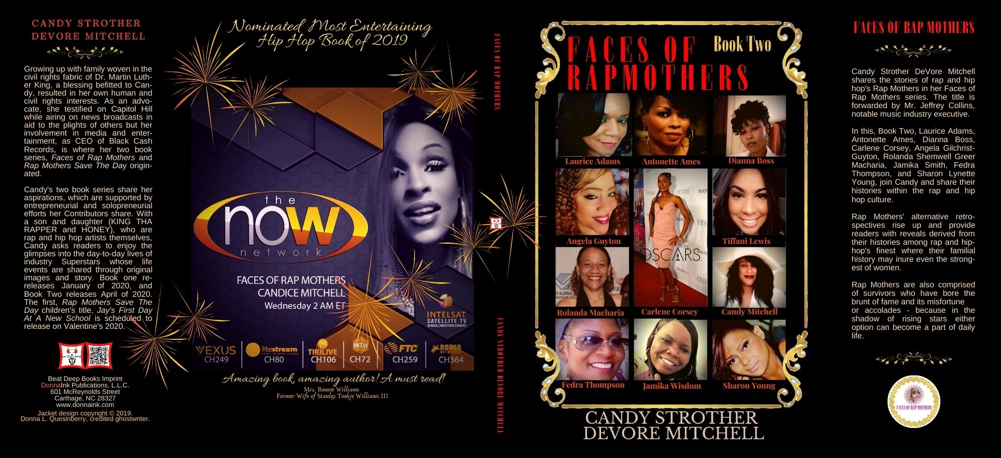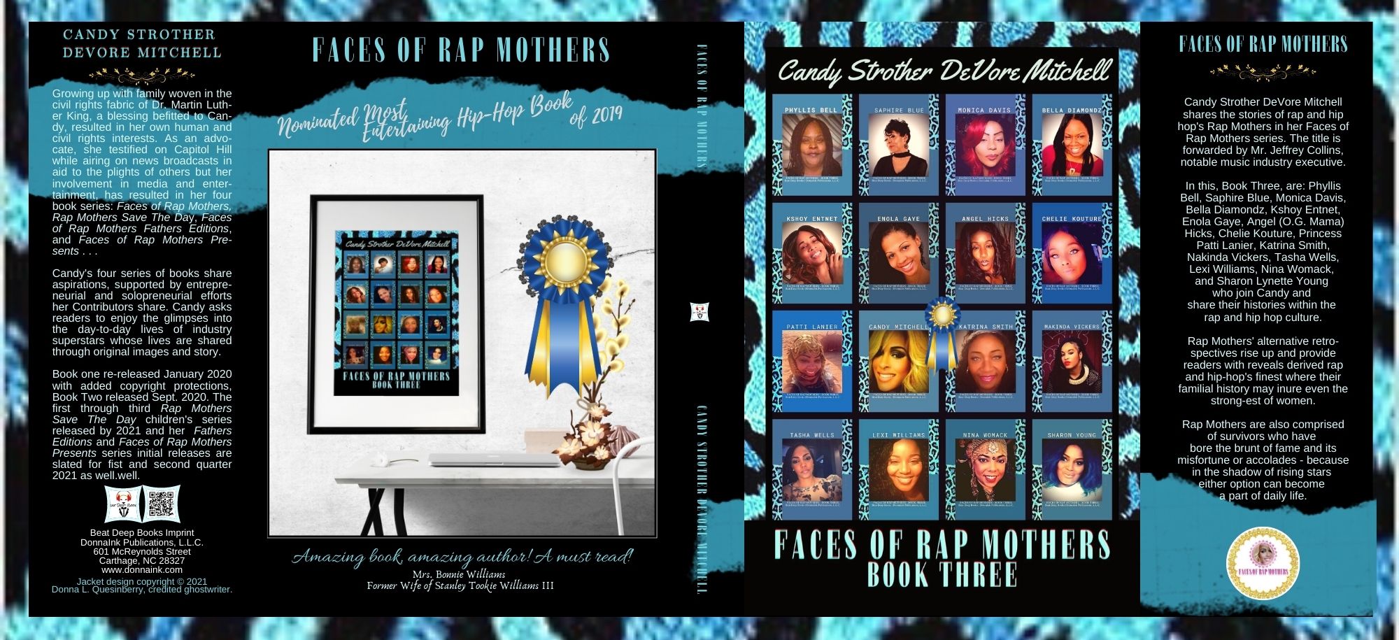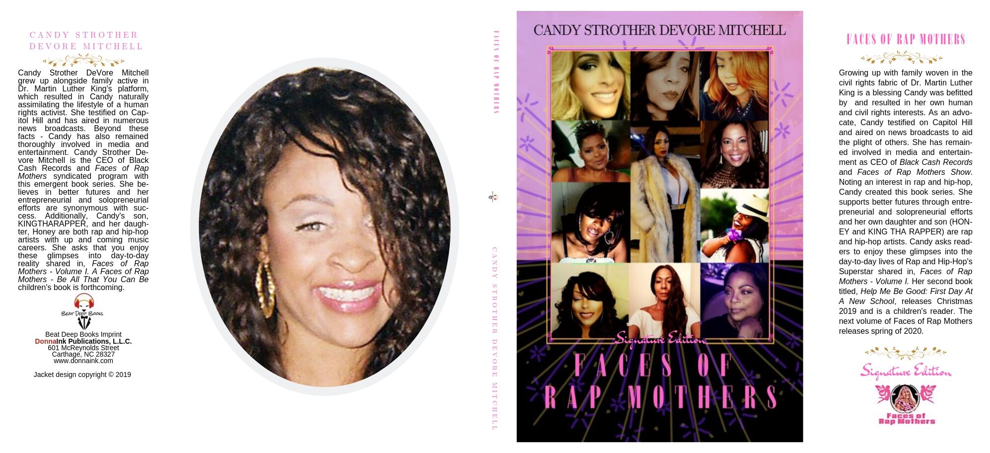 About Faces of Rap Mothers®™: is a woman’s organization created by Candy Strother DeVore Mitchell that conjoins, empowers, and unites women enplaning roles as coaches, comedians, entertainers, entrepreneurs, healers, sages, and homemakers among associates, families and friends, rap and hip-hop industry icons, readers, and fans. Faces of Rap Mothers®™ delivers a real-time evolutionary capture of an industry transitioning from angst, animosity, and sexism to acceptance, goodwill, and propriety while continuing in their zeal for entertainment through the inception, intervention, and reinvention of Rap Mothers®™ (e.g.: mothers, daughters, sisters, aunts, cousins, and affiliates of rap and hip-hop iconic figures) nationally and internationally while strategizing patterned abundance, growth-ignition, and resilience in the reformation of history from the lens of women engaged in futures-planning.