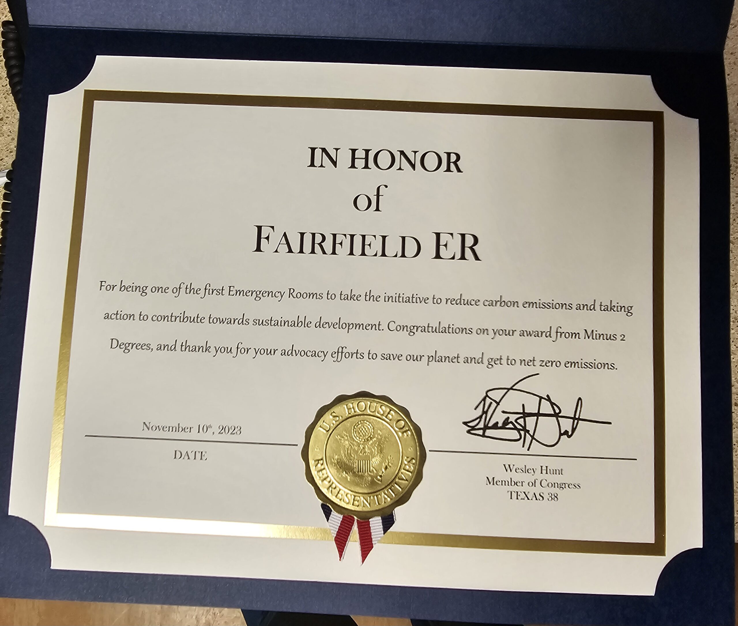 As a winner of the Road to Net Zero Award, Fairfield ER will continue implementing innovative measures to lower emissions, waste, and our environmental impact. We aim to inspire other healthcare providers to evaluate their facilities and join us on this important sustainability journey.