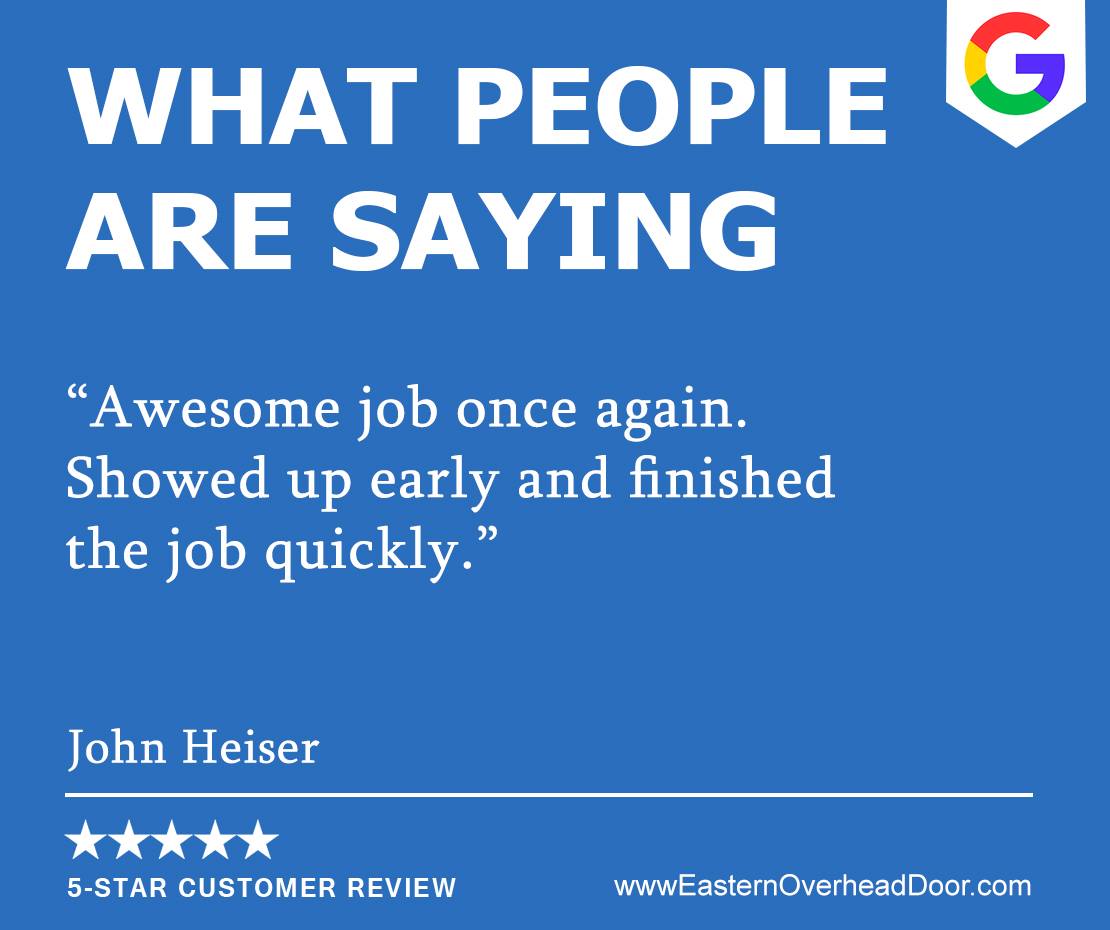Eastern Overhead Door is not just a family-owned business. It is a small business that treats its customers like family. For this reason, customers, members of the community, and other people in the industry will be happy to congratulate the team at Eastern Overhead Door for reaching this significant business milestone. Simply visiting the Eastern Overhead Door website or Facebook will show hundreds of five-star reviews, a testament to the immense dedication and exceptional service and professionalism Eastern Overhead Door has provided over the years.