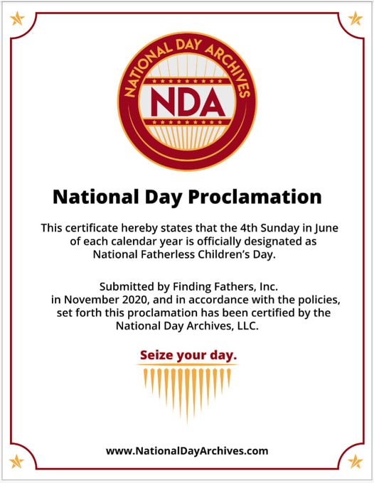 Orange Park, Florida Nov 26, 2020 (Issuewire.com) - Finding Fathers Inc. founder, Donald R. Adams II, proclaimed the fourth Sunday in the month of June of each calendar year as National Fatherless Children’s Day! The first NFCD, which is officially recognized by National Day Archives, will take place on June 27, 2021, and will recognize children and families that have been affected by fatherlessness. NFCD can be celebrated by giving gifts and support to those affected by fatherlessness, or by contacting Finding Fathers Inc. to see how you can become a volunteer, supporter, contributor, or member in its efforts to fight this pandemic.