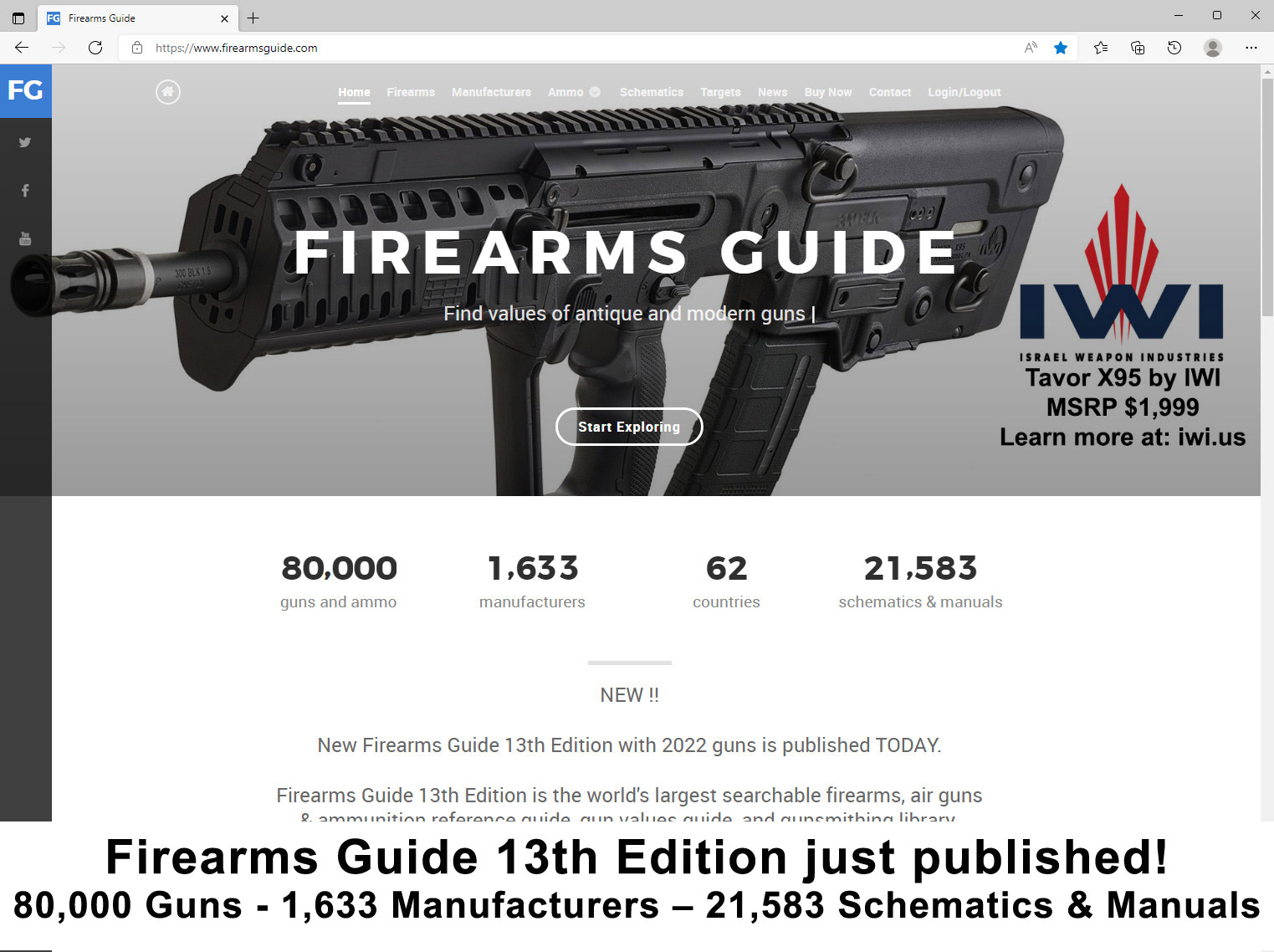 “The New Firearms Guide 13th Edition is the world’s largest searchable guns & ammo reference guide that presents over 80,000 antique and modern firearms, air guns, and ammunition from 1,633 manufacturers from 62 countries. With its 14 search criteria, Firearms Guide enables fast, complex searches of 80,000 antique and modern guns and side-by-side comparisons of search results. Guns are cross-referenced with the huge ammunition database. Firearms Guide searchable Ammo Database has over 7,000 different rounds with ballistics and ammo pictures and is often used by ballistic labs and police departments. Guns and ammo are presented with prices, tech specifications, features, gun values, ballistic, and up to 12 high-resolution zoomable color pictures. With over 58,000 gun pictures (in resolution up to 4000 x 1240) and with the biggest online visual (graphic) Gun Codes, Proof Marks, Stamps, and Crests Guide, Firearms Guide is a great tool for fast and precise firearms identification of antique and modern civilian and military guns from 1,633 manufacturers and 62 countries" says Chris Mijic, publisher of Firearms Guide.