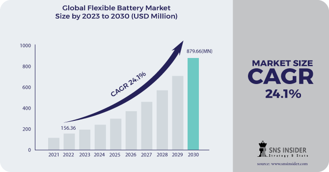 The Flexible Battery Market, valued at USD 156.36 million in 2022, is projected to grow at a Compound Annual Growth Rate (CAGR) of 24.1% from 2023 to 2030, reaching USD 879.66 million by 2030.