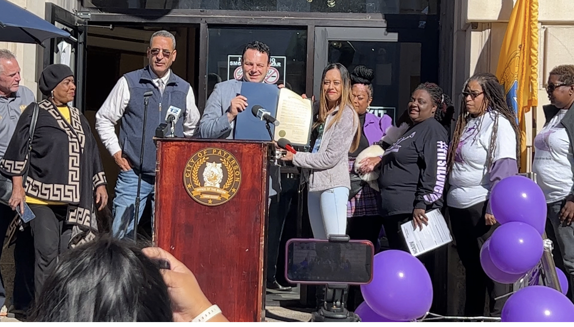 “In Paterson, we are particularly appreciative and profoundly grateful to a young woman who has been raising public awareness as an advocate and as a victim relative to domestic violence. So, to lead today's program, I'm proud to present a proclamation for all of her exemplary efforts to advocate on behalf of other victims. Ladies and Gentlemen, please join me in a round of applause for our honoree, Francesca Nunez. And in addition to presenting this Proclamation to Francesca. I'm proud to proclaim in Patterson that this is domestic violence month”, these were the words of the Mayor of the city of Paterson, Mr. Andre Sayegh.