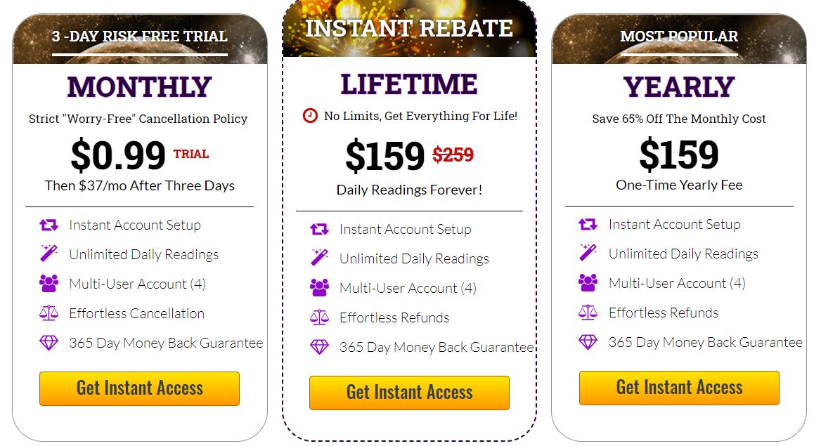 If you are not satisfied with the reading, they give a triple money-back guarantee for 365 days which means you can try it risk-free. It's available for just $37 monthly and $159 for lifetime access.