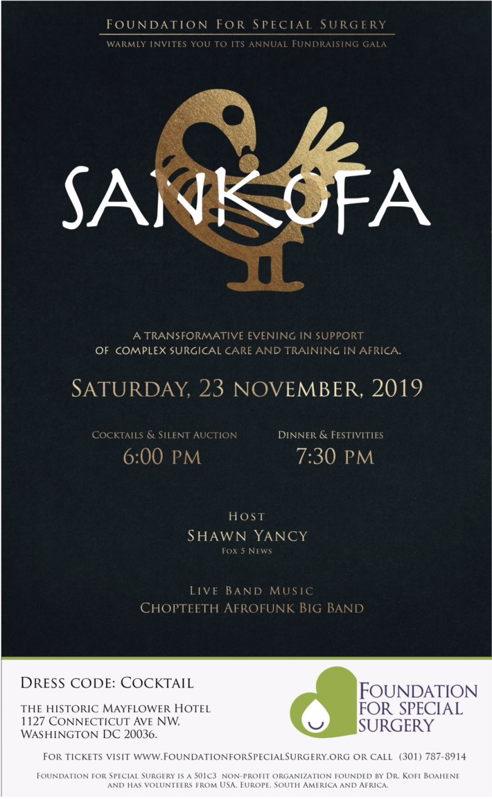 District of Columbia, United States Nov 17, 2019 (Issuewire.com) - The Foundation for Special Surgery will hold its 2nd Sankofa Dinner Gala, a unique and transformative evening in support of complex surgical care and training in Africa. The highly anticipated gathering will be held on November 21, 2019, from 6:00 pm to 11:30 pm at the historic Mayflower Hotel, 1127 Connecticut Ave., NW, Washington DC.